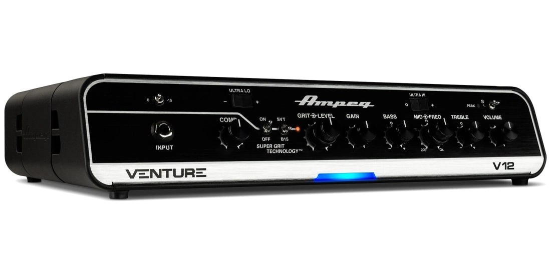 The Ampeg Venture® Series V12, V7, and V3 bass heads deliver the modern style and features sought by contemporary bassists. Their easy-to-use and intuitive controls include an extensive array of tone-shaping tools, such as Ampeg's Legacy Preamp and 3-band EQ with sweepable mids, Ultra Hi/3-way Ultra Lo switches, a footswitchable SGT Overdrive circuit with SVT and B15 voicings, and a variable compressor. All circuitry is analog except for the solid-state Class D amplifiers.