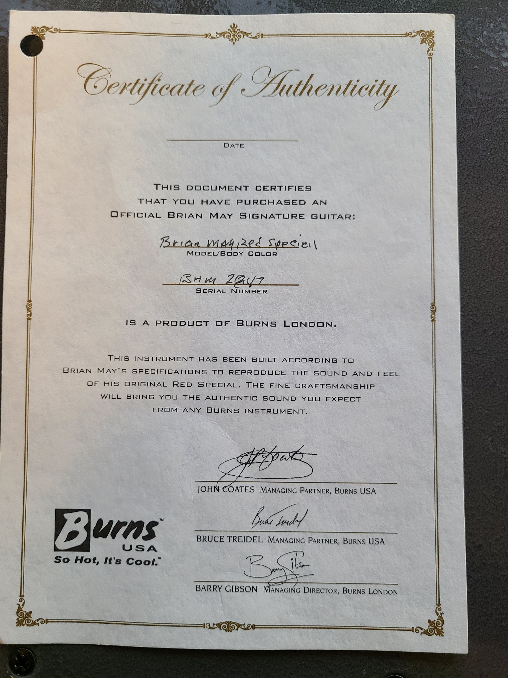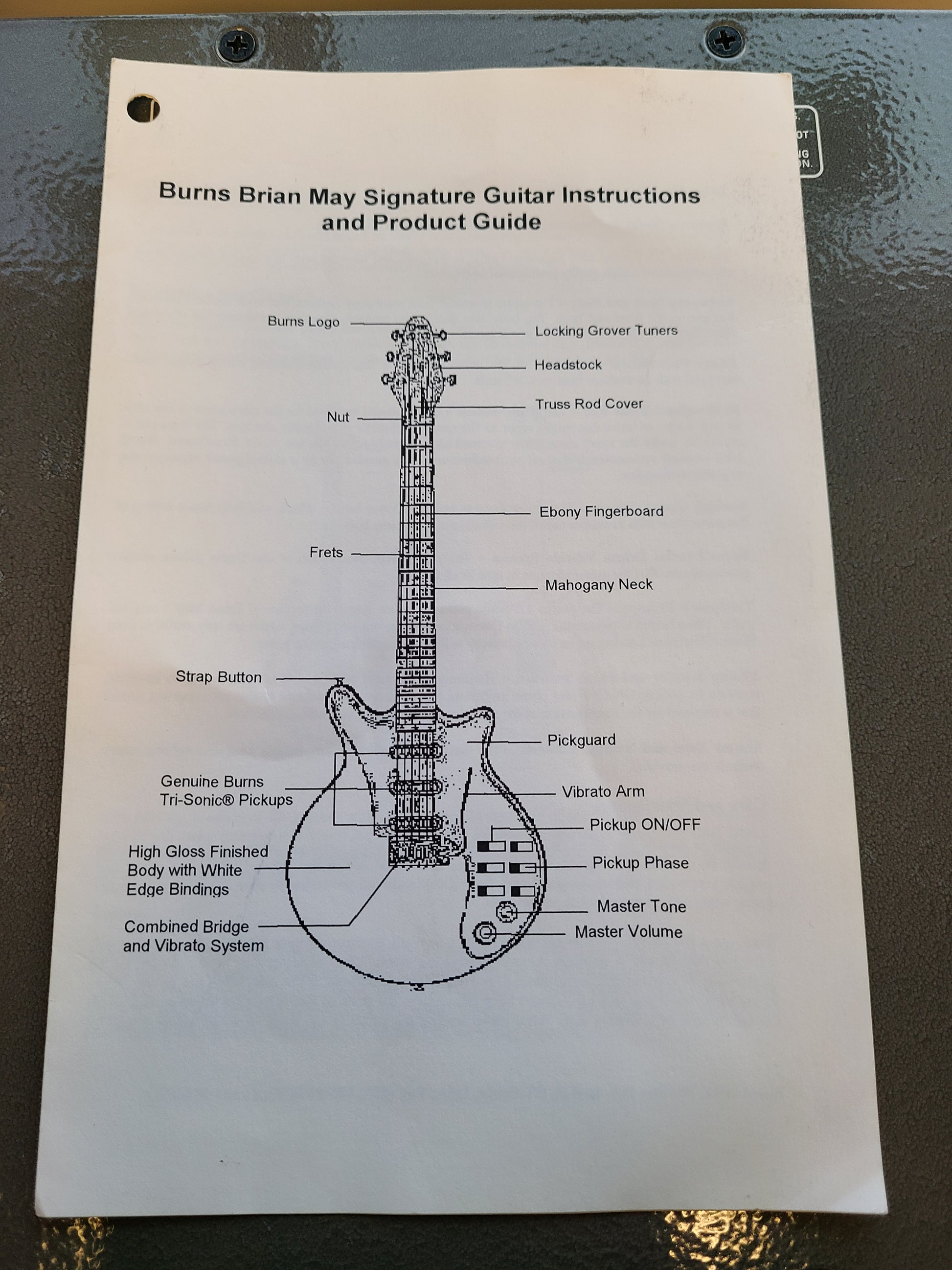 Just IN!! Used Burns of London Brian May Special. This is the earlier Burns model made in South Korea, not the current run made in China. This guitar is in excellent condition and had very little noticeable play wear (very light swirl if you look hard enough). Comes with the legendary Tri-Sonic pickups - this thing DOES Queen!! Included Burns hardshell case and certificate of authenticity.