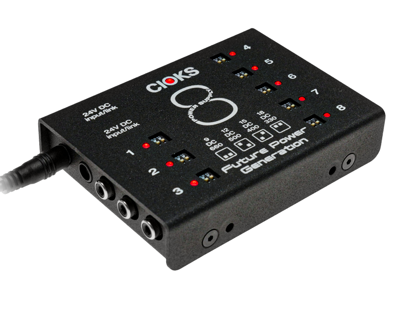 CIOKS 8 is our largest switch-mode power supply expander and it features 8 isolated outlets which each deliver 9V DC at 660mA. All outlets offer four selectable voltages (9, 12, 15 or 18V).