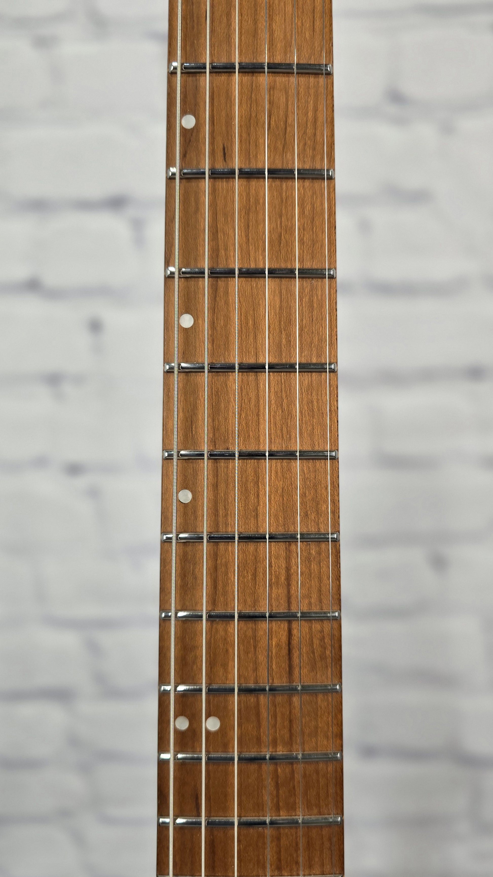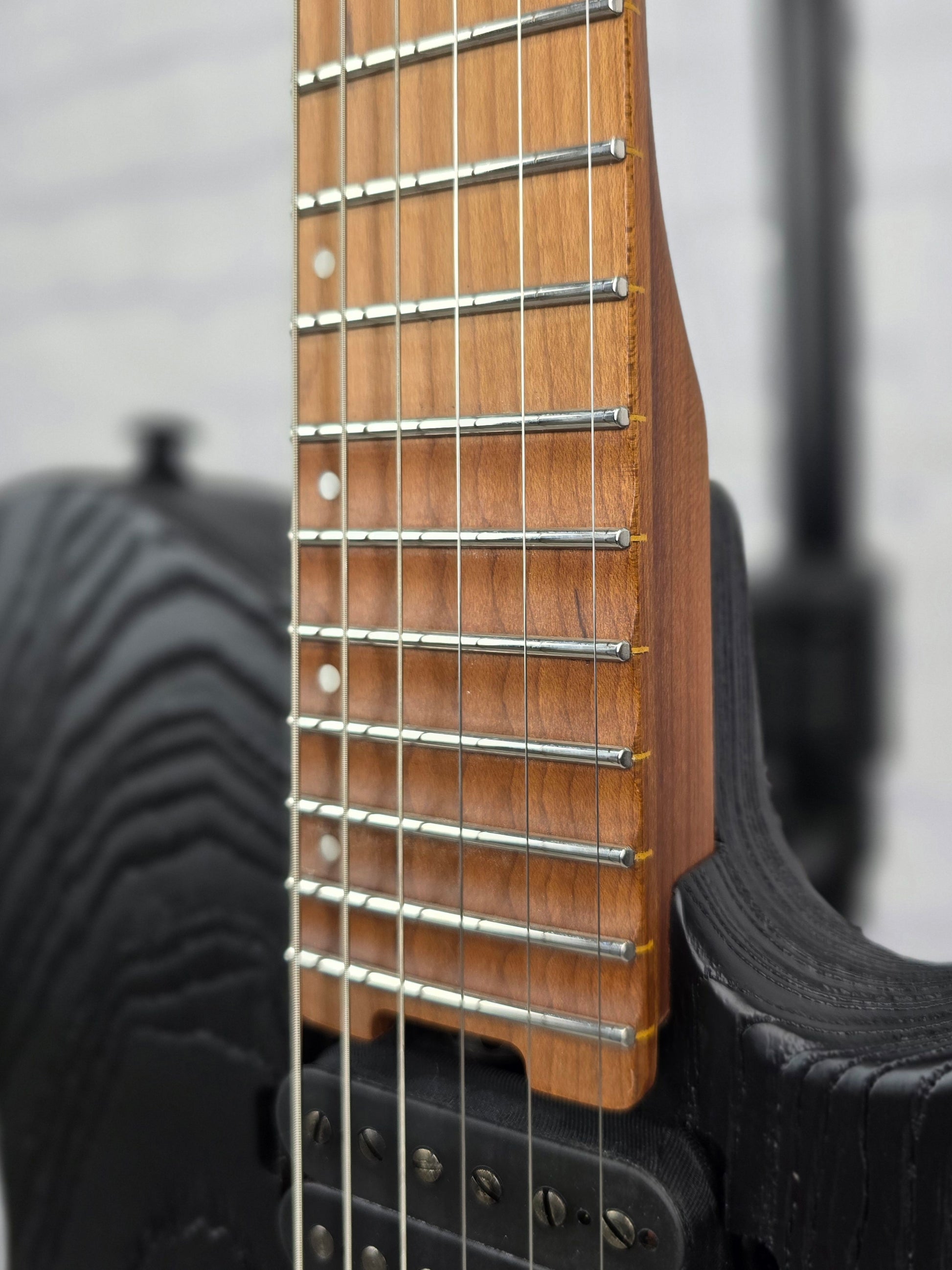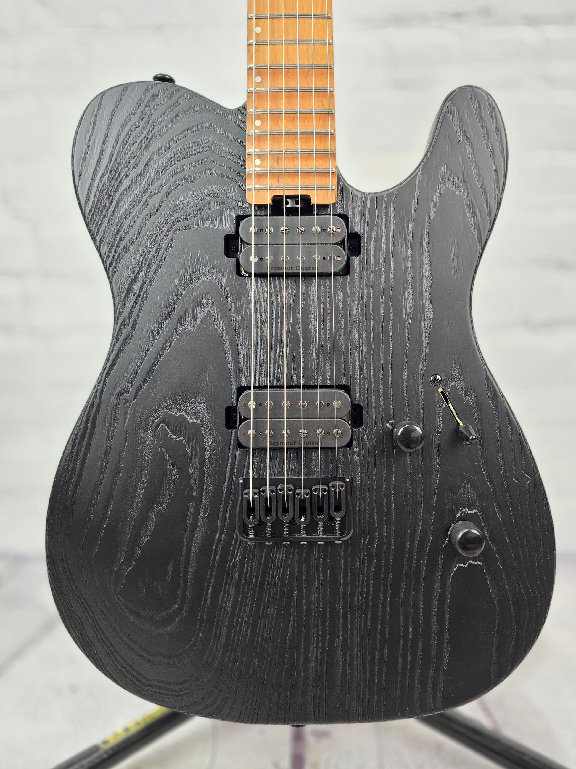 The TE-1000 Black Blast offers a bolt-on construction Swamp Ash body with an outstanding textured black sandblasted finish that looks amazing contrasted against its roasted maple neck, with 22 extra-jumbo stainless steel frets and offset abalone dot inlays. This guitar also includes a scalloped fingerboard from frets 17-22 for excellent lead performance expression possibilities.