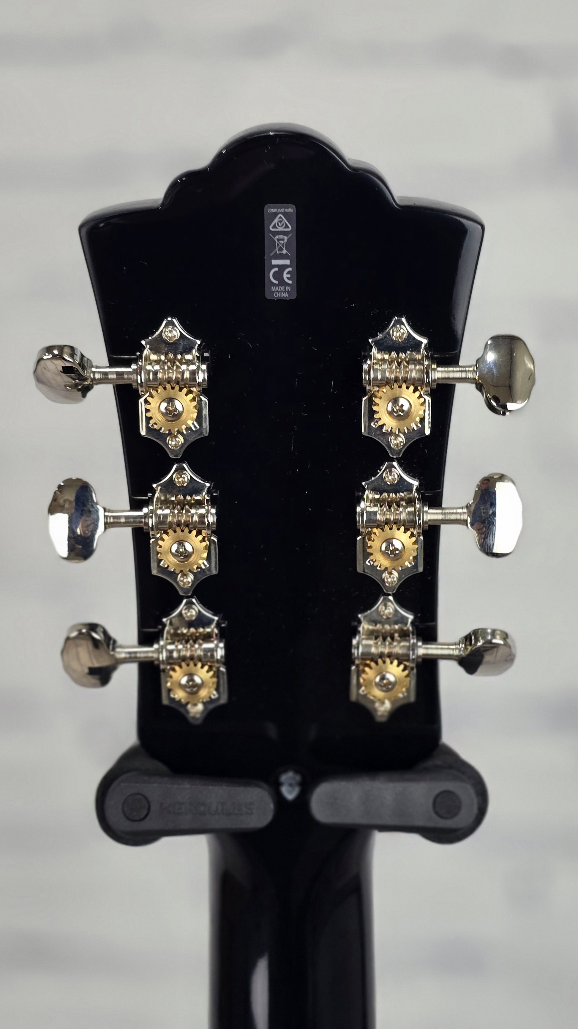 The D-140 models from Guild are performance-driven dreadnoughts with all the playability, tone, and vibe that have made Guild a go-to name for discerning players for over 70 years. The D-140CE Black adds a new color option to the ever-popular D-40 and D-140 lineup, pairing an eye catching black high gloss finish that contrasts beautifully with white binding and Mother-of-Pearl inlays in the rosette and headstock. Premium specs like all solid tonewoods, bone nut/saddle, a Fishman GT-1 pickup system, and Guild's Premium quilted gig bag with microfleece interior make the D-140CE a professional level instrument packed with incredible value. This full-bodied and powerful dreadnought provides guitarists with a classic acoustic sound and balanced voicing from its all-solid tonewoods. Solid Sitka spruce for the top and solid African Mahogany for the back and sides are a prime combination, scalloped bracing and rosewood fingerboard and bridge give this instrument a punch and tonality that define the Guild sound.