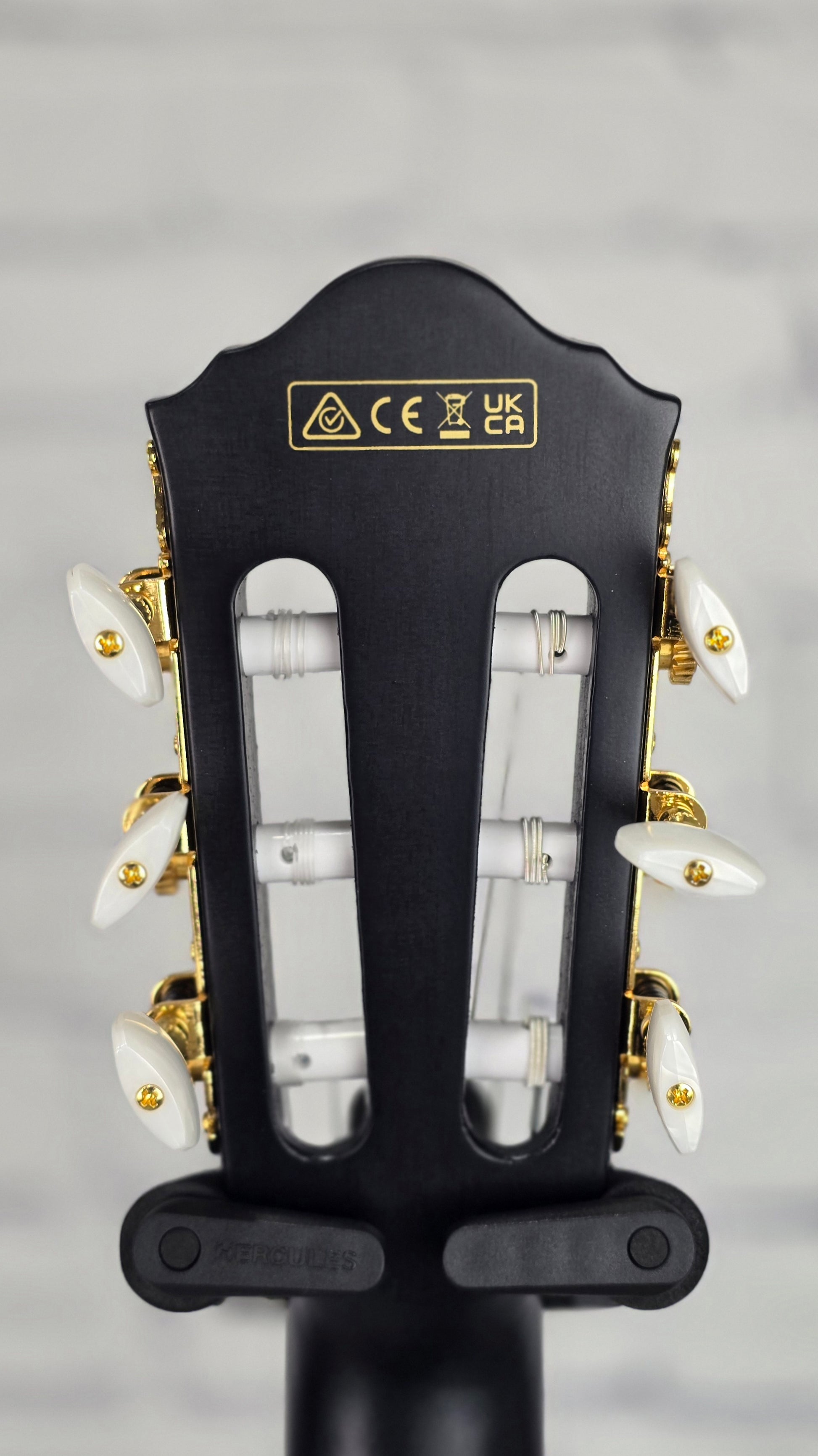 Its thin, compact body and superior high fret access contribute to the superb playability of this guitar. It has less feedback as there's no sound hole on the body top. Fan bracing, which is commonly used for classical guitars, allows this guitar to have a warm and natural nylon string sound.