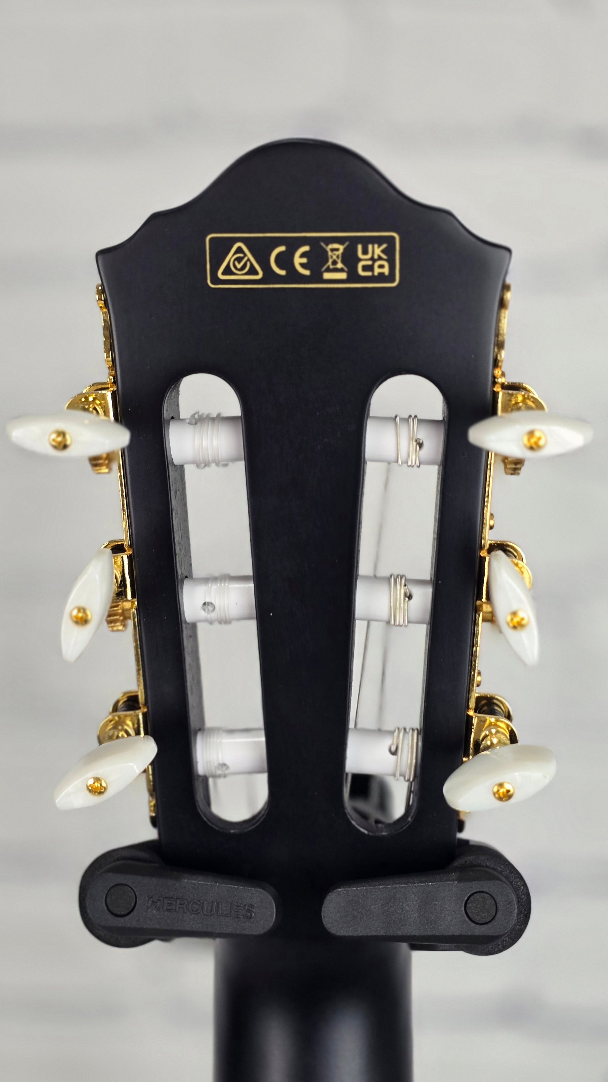 Its thin, compact body and superior high fret access contribute to the superb playability of this guitar. It has less feedback as there's no sound hole on the body top. Fan bracing, which is commonly used for classical guitars, allows this guitar to have a warm and natural nylon string sound.