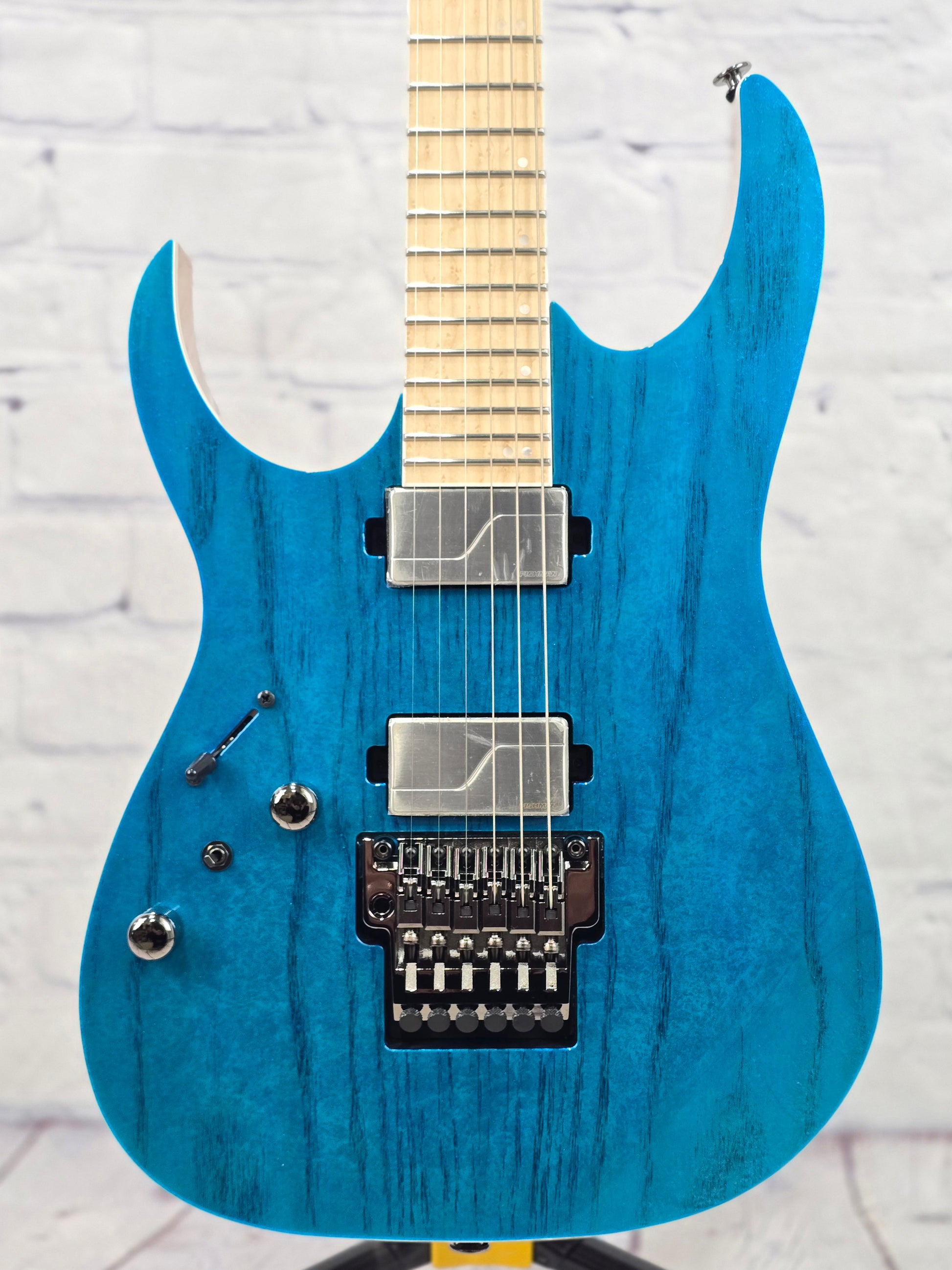 It's hard not to notice the RG5120M. Constructed with a stunning Frozen Ocean finish ash-top and African Mahogany body, 5-piece Maple/Wenge neck and Birdseye Maple fretboard with Mother of Pearl inlay. The Fishman Fluence Modern Humbucker Ceramic pickups are also hard to ignore, producing a modern, active high-output sound or a crisp, clean and fluid sound. The Lo-Pro Edge bridge offers maximum playing comfort due to its streamlined profile and recessed fine tuners. Includes a luminescent side-dot inlay- the RG5120M is sure to stand out in any setting.