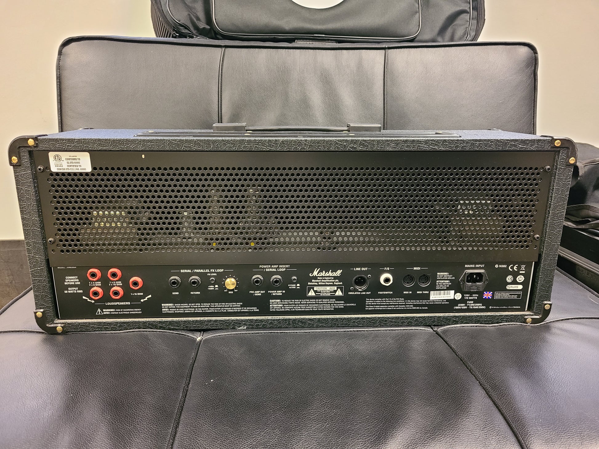 Speaker outputs: 5 x 1/4" jack sockets (16Ω load / 8Ω load / 4Ω load), Emulated Line Out (XLR), MIDI Thru