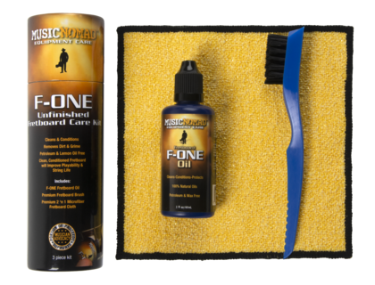 A cleaned & conditioned fretboard will not only improve playability & string life, but prolong the health of the unfinished fretboard wood by keeping it from drying and cracking. MusicNomad’s F-ONE Unfinished Fretboard Care Kit contains everything you need to clean & condition your unfinished fretboard. F-ONE Oil is formulated using a complex mixture of the finest ultra refined tree & seed oils to clean, condition & protect your fingerboard. F-ONE does not contain any lemon oil extracts, waxes, petroleum distillates, silicone or water. Our innovative 2 ‘n 1 microfiber fretboard cloth is like no other. One side is soft for gentle applying & cleaning with F-ONE, while the other side is designed with small scrubbers woven into the fabric to penetrate & lift dirt & grime buildup off the fretboard. Our specially designed fretboard brush is the perfect tool for precision cleaning & conditioning around the frets & deeper wood pores. Featuring a “V-Cut" bristle design & a bonus plastic scraper, you’re fully prepared to give your fretboard the total spa treatment it deserves. That’s MusicNomad quality - raising the bar in equipment care.