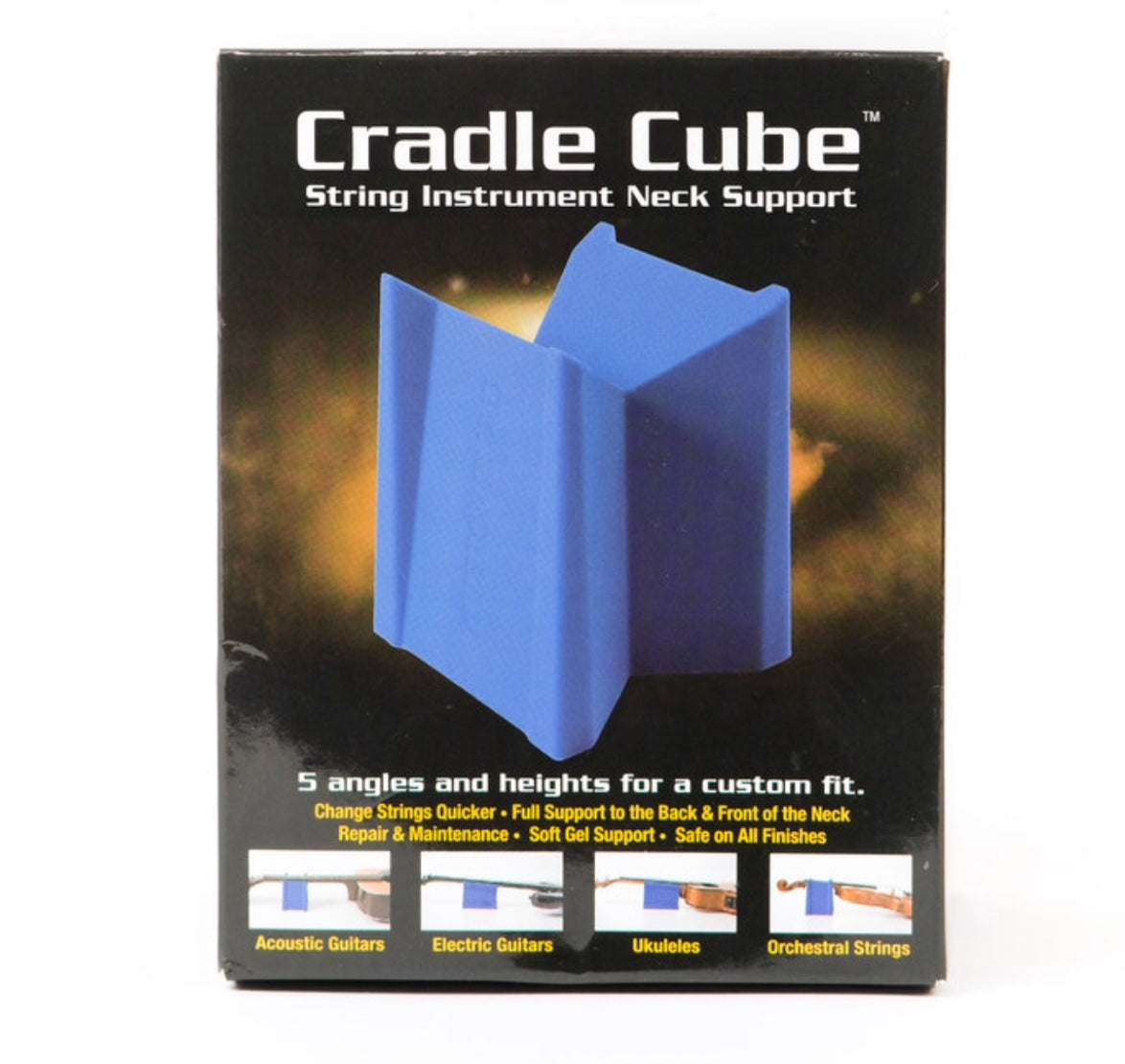 Neck cradle has five angles and heights for a custom fit for any instrument