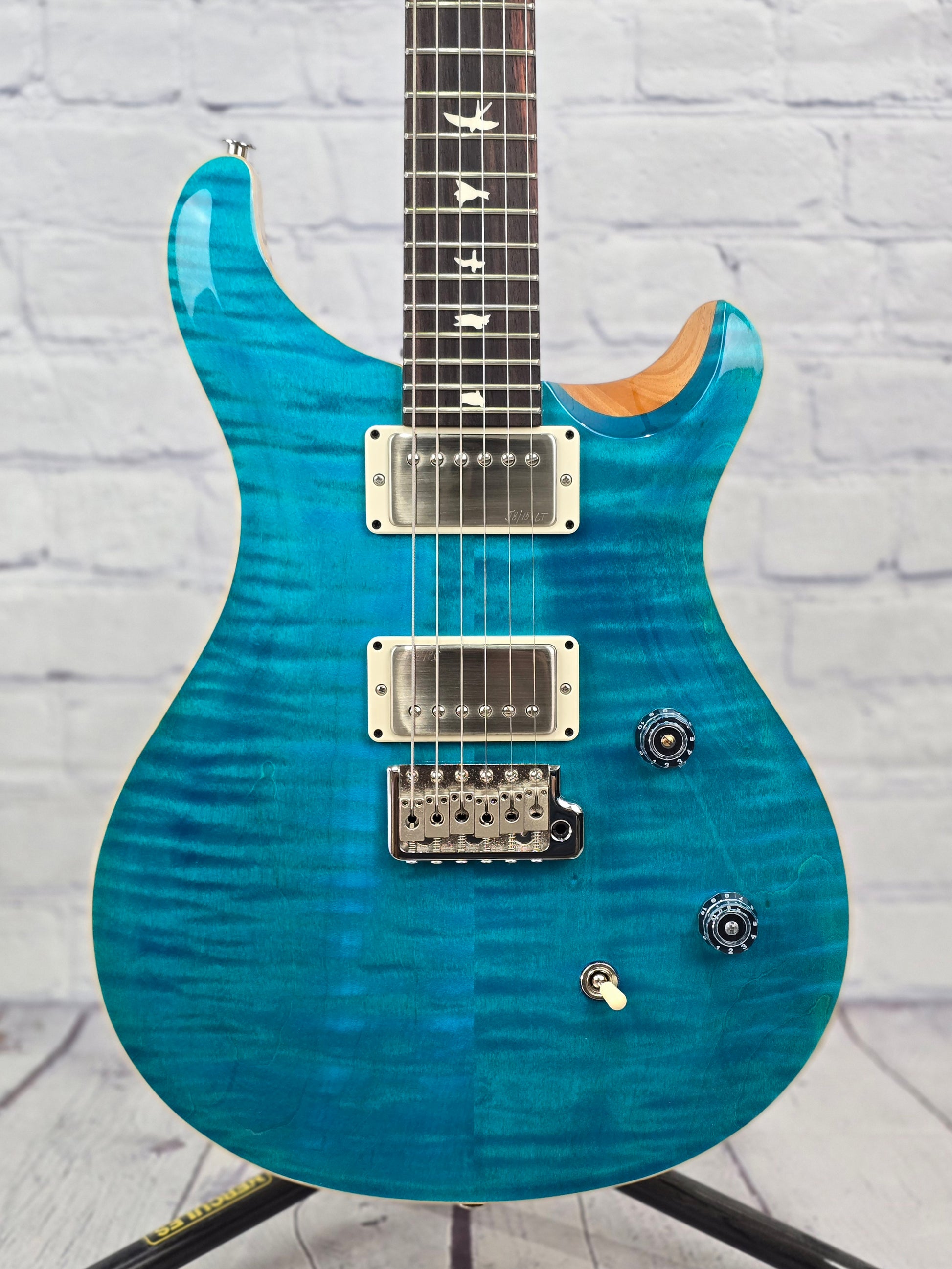 This particular CE24 is unique. It was factory equipped with a set of covered 58/15 pickups in brushed nickel. Whether this was a "happy-accident" or by design, this is a very rare 24 fret guitar with the more vintage feeling 58/15 pickups - which may make this the guitar you've always been dreaming of from PRS. The electronics consist of a volume and push/pull tone control with 3-way toggle switch for a total of six classic sounds.