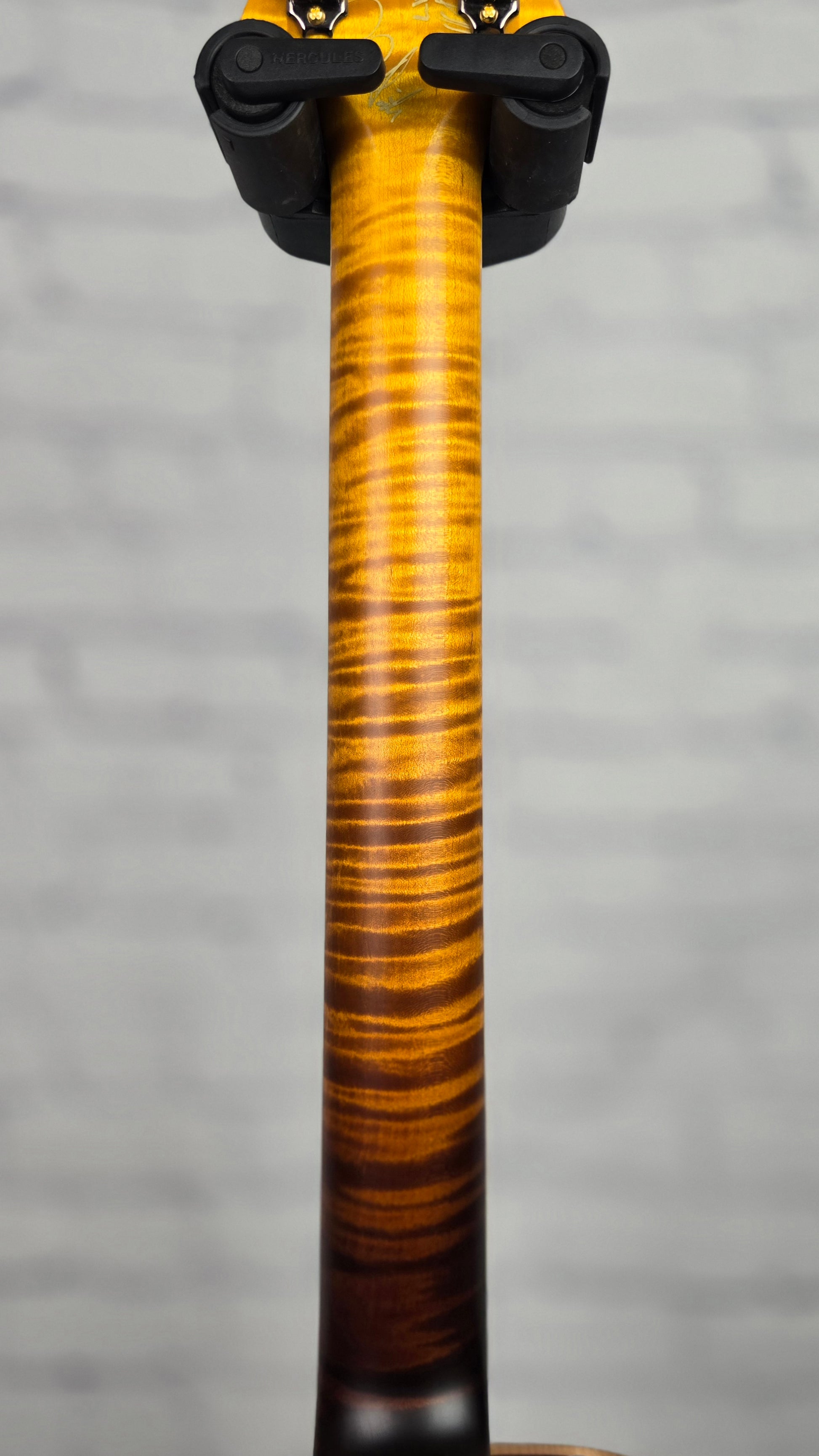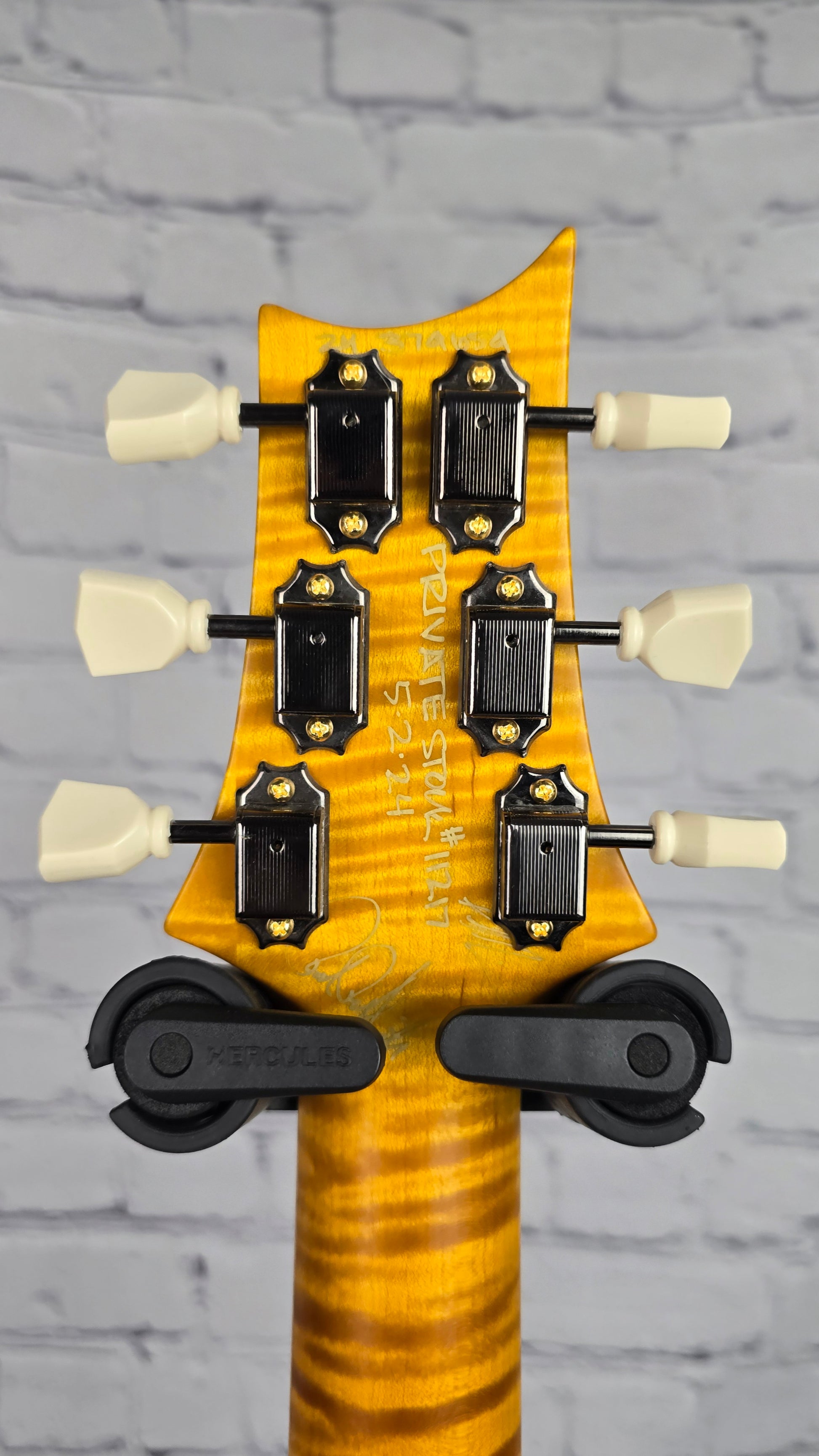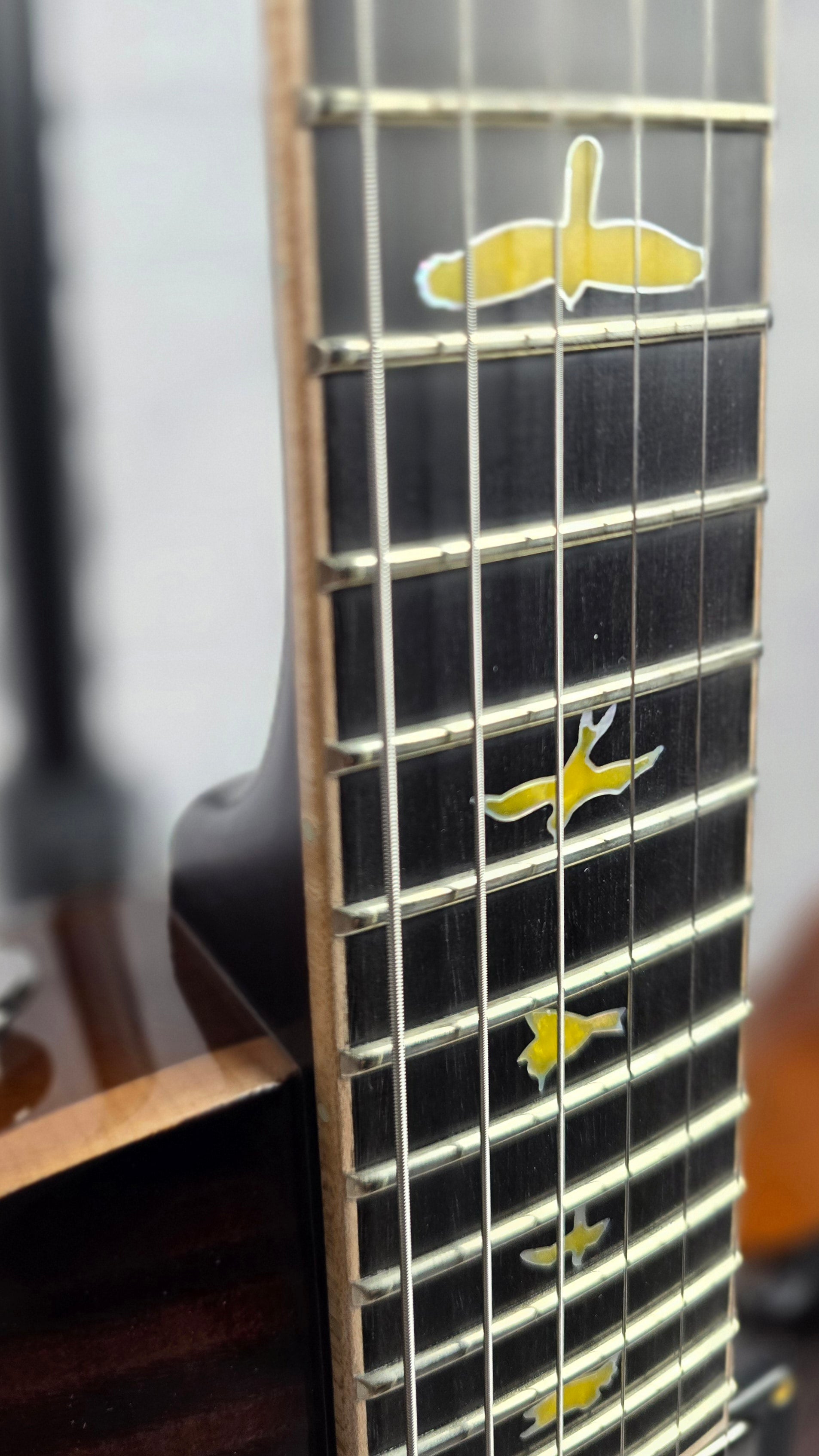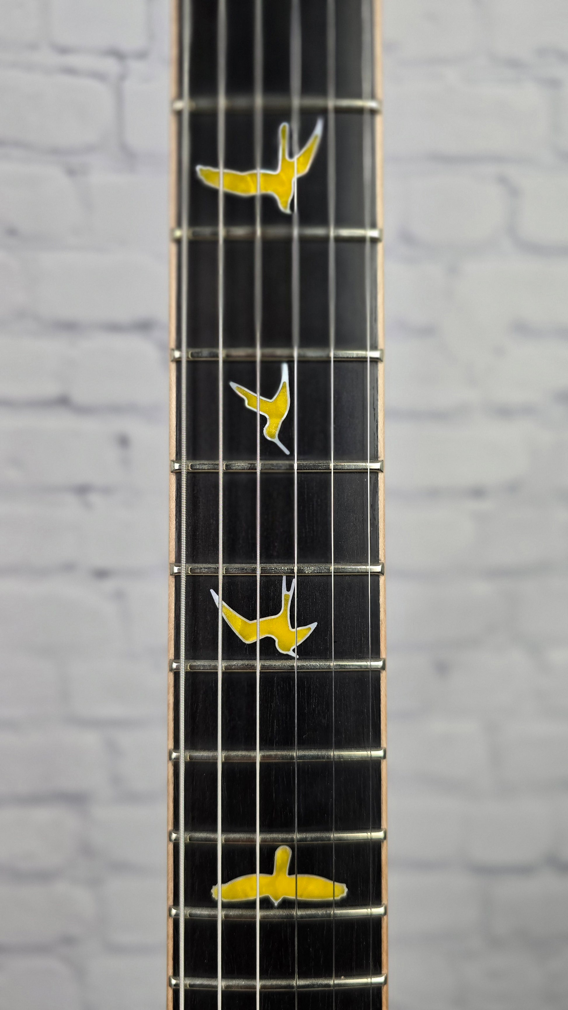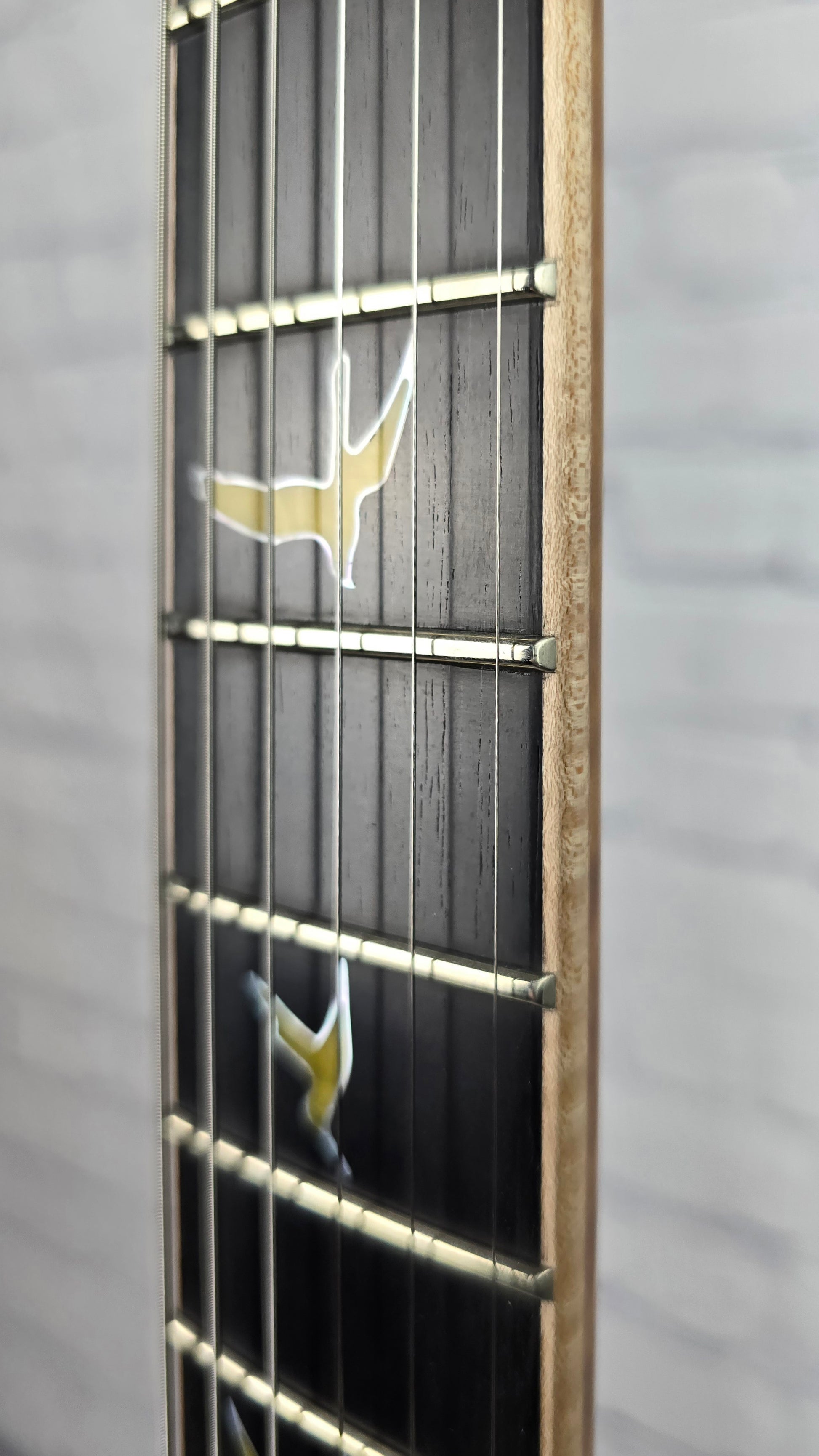 The insane features do not stop yet - this guitar also features an incredible highly figured curly maple neck and headstock overlay veneer, both stained to match the vibrant McCarty Glow top. The signature PRS Birds are crafted with a resin swirl to match the tone of the body and finished with a beautiful mother of pearl outline. The fretboard is ultra dark ebony, but given a tasteful curly maple binding treatment for a contrasting, high end look.