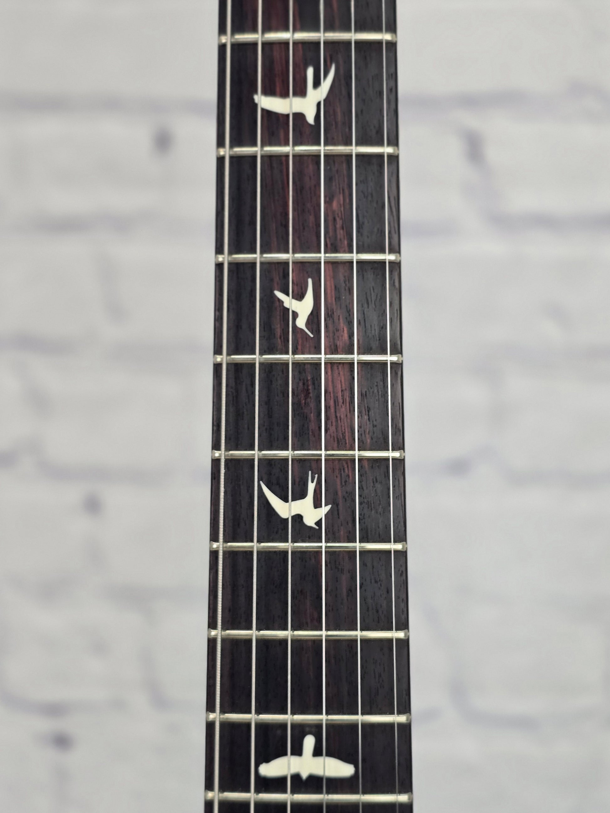 Some of the more distinctive specifications include, the headstock shape, tuners, bridge, pickups, and neck and fretboard options. The headstock shape is based on PRS’s trademark design, but inverted both to accommodate Mayer’s playing style and also to keep a consistent length of string behind the nut, which makes staying in tune easier. The tuners are a traditional vintage-style, closed-back tuner, but with PRS’s locking design. The steel tremolo takes the patented PRS design and incorporates Gen III knife-edge screws. Setup flush to the body in the neutral position so that the tremolo bridge only goes down in pitch, the bridge’s increased contact with the body allows the guitar itself to be acoustically louder, which in turn improves the signal to noise ratio of the single-coil pickups. The 635JM single-coil pickups are very round and full, with a musical high end that is never “ice-picky” or brash.