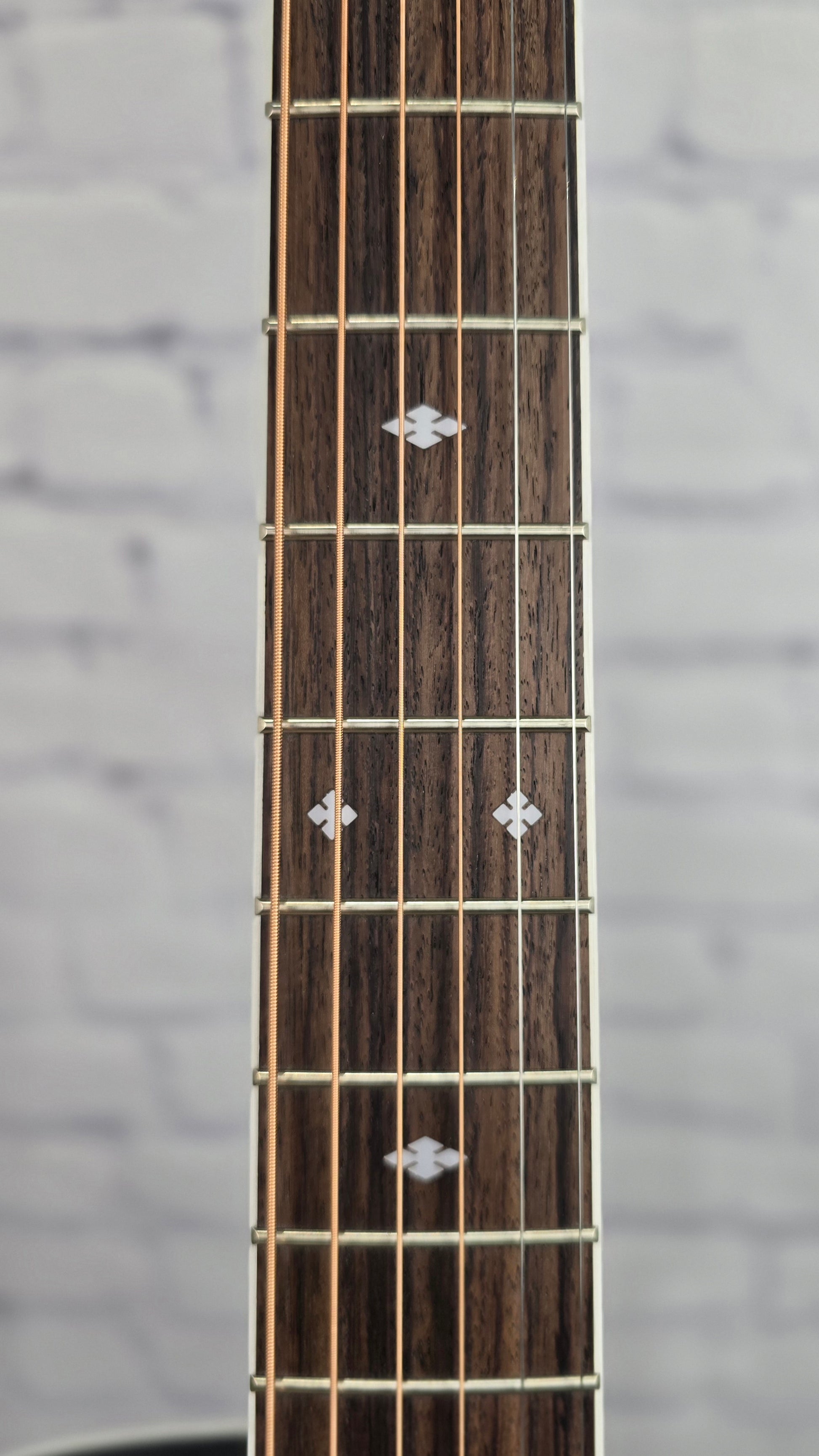 This guitar has been the choice of pro musicians of all genres. The versatility of this guitar begins with its solid cedar top that can play sweet mellow passages or power chords with equal ability. The maple back and sides are a perfect reflector for the tone generated by the soundboard and the gloss black finish looks great under the stage lights. The mahogany neck is joined to the body with a traditional, ultra strong dovetail joint.