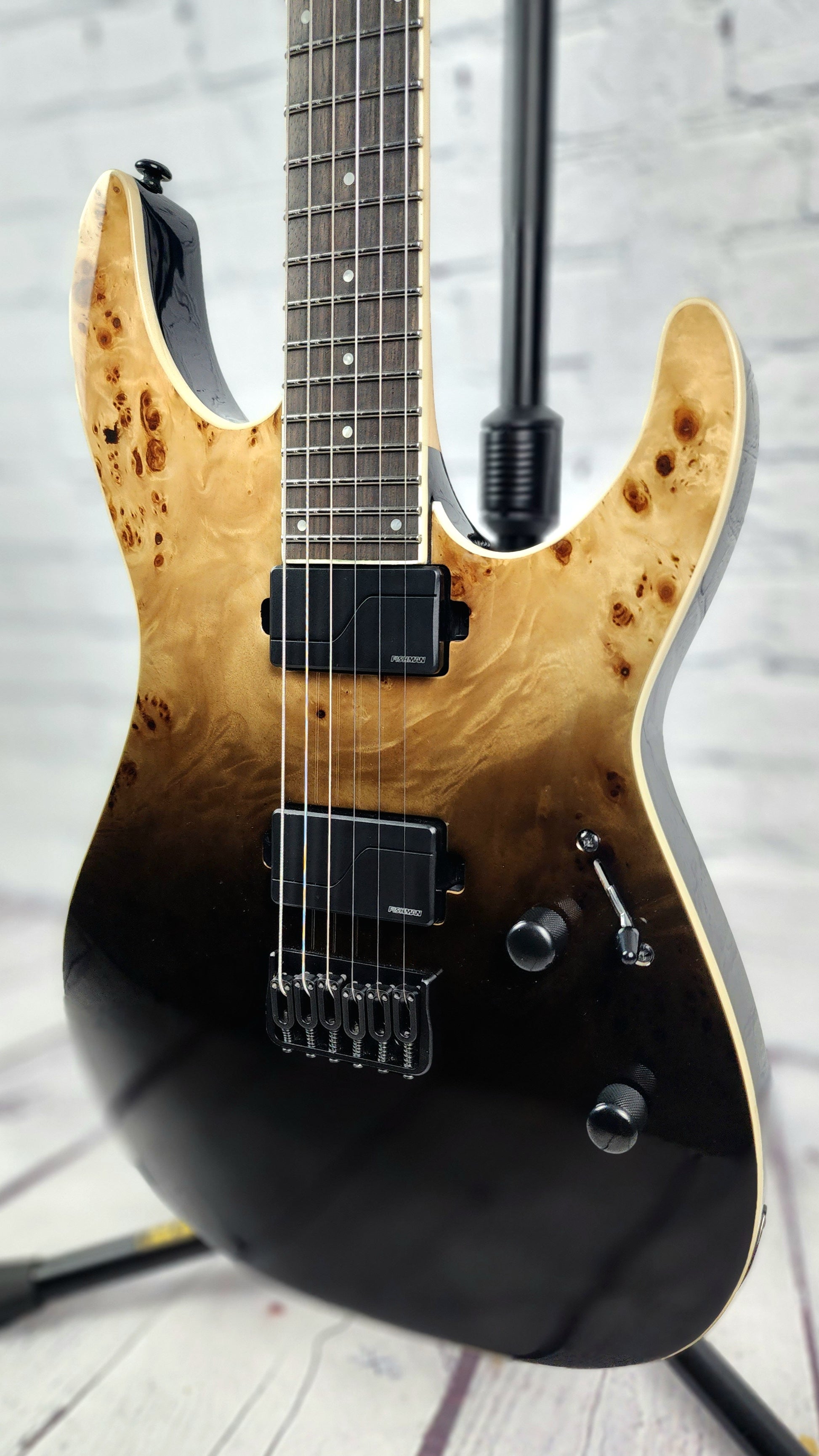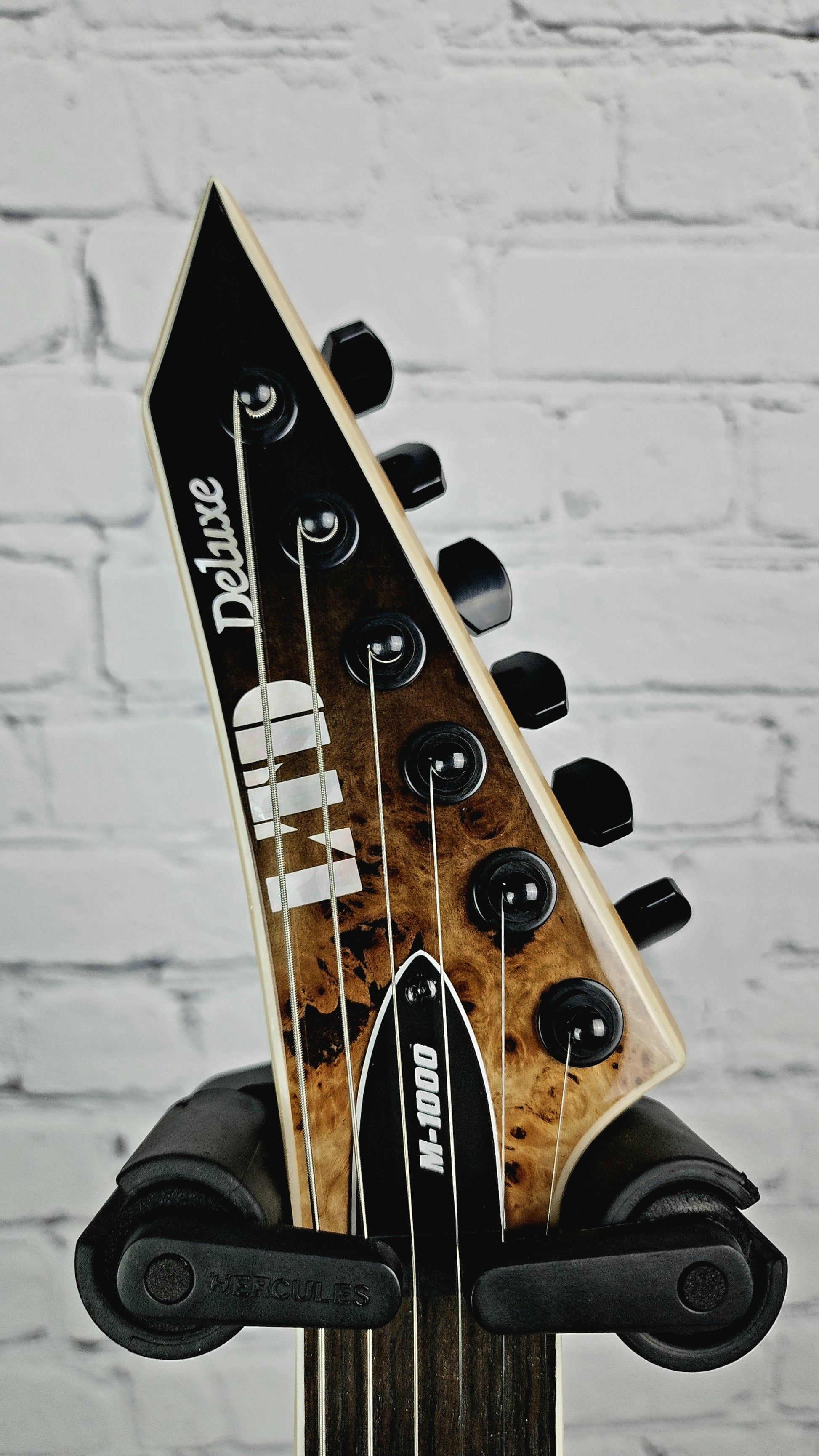 The M-1000 was built to turn heads with its good looks, then wow the audience with its tone. It all begins with a 3-piece maple neck in a neck-through-body configuration with increased sustain. Two alder wings are attached to each side of the neck to boost resonance and provide a well-balanced tone. Finally, an eye-catching poplar burl top is added to the body. Once it's fully assembled, the body receives extra carving for player comfort. You'll appreciate the generous belly cut that makes onstage performance comfortable, and when you strap on your new LTD for the first time, you'll appreciate the deep cutaways that give you total access to the upper frets.