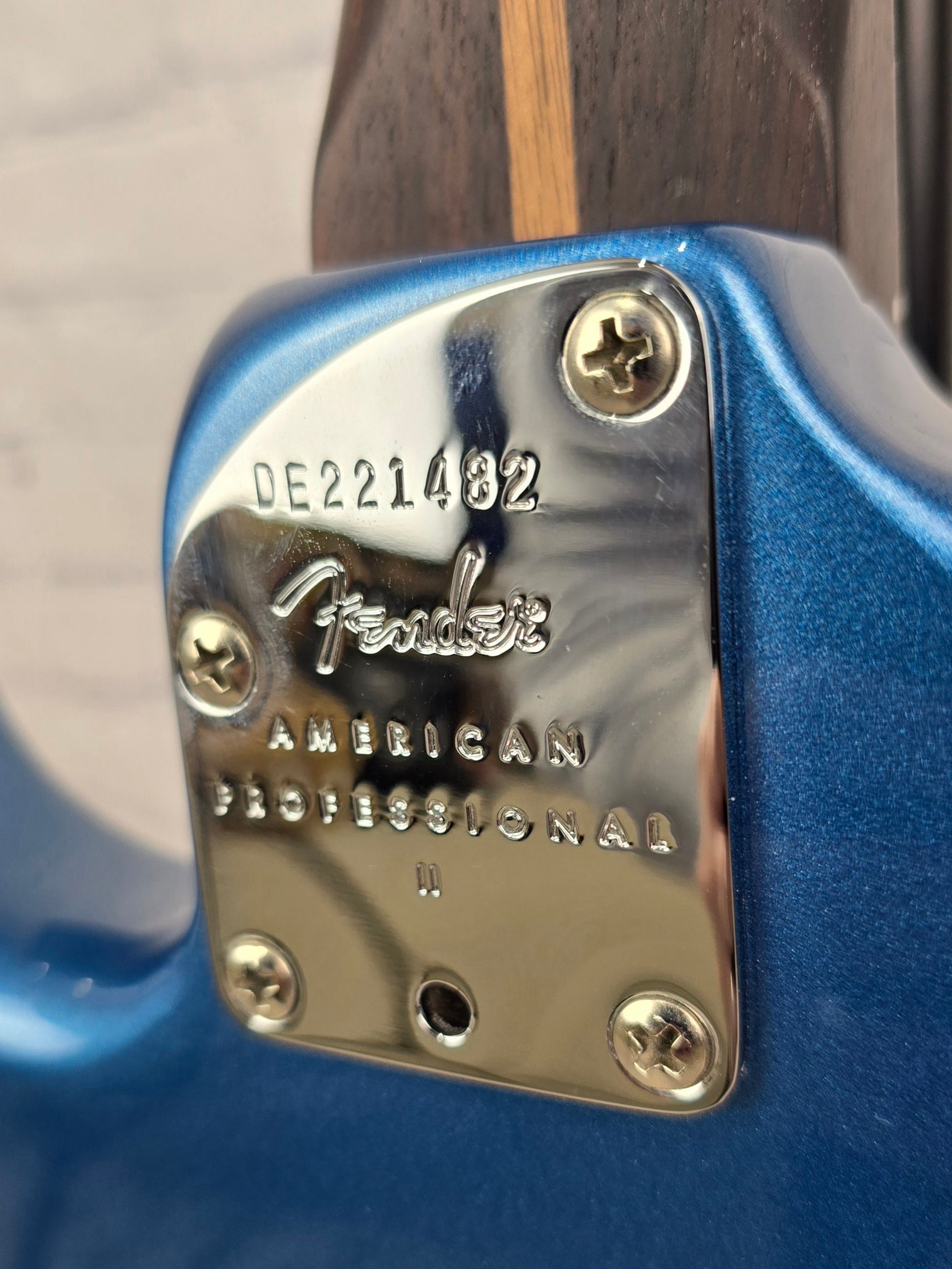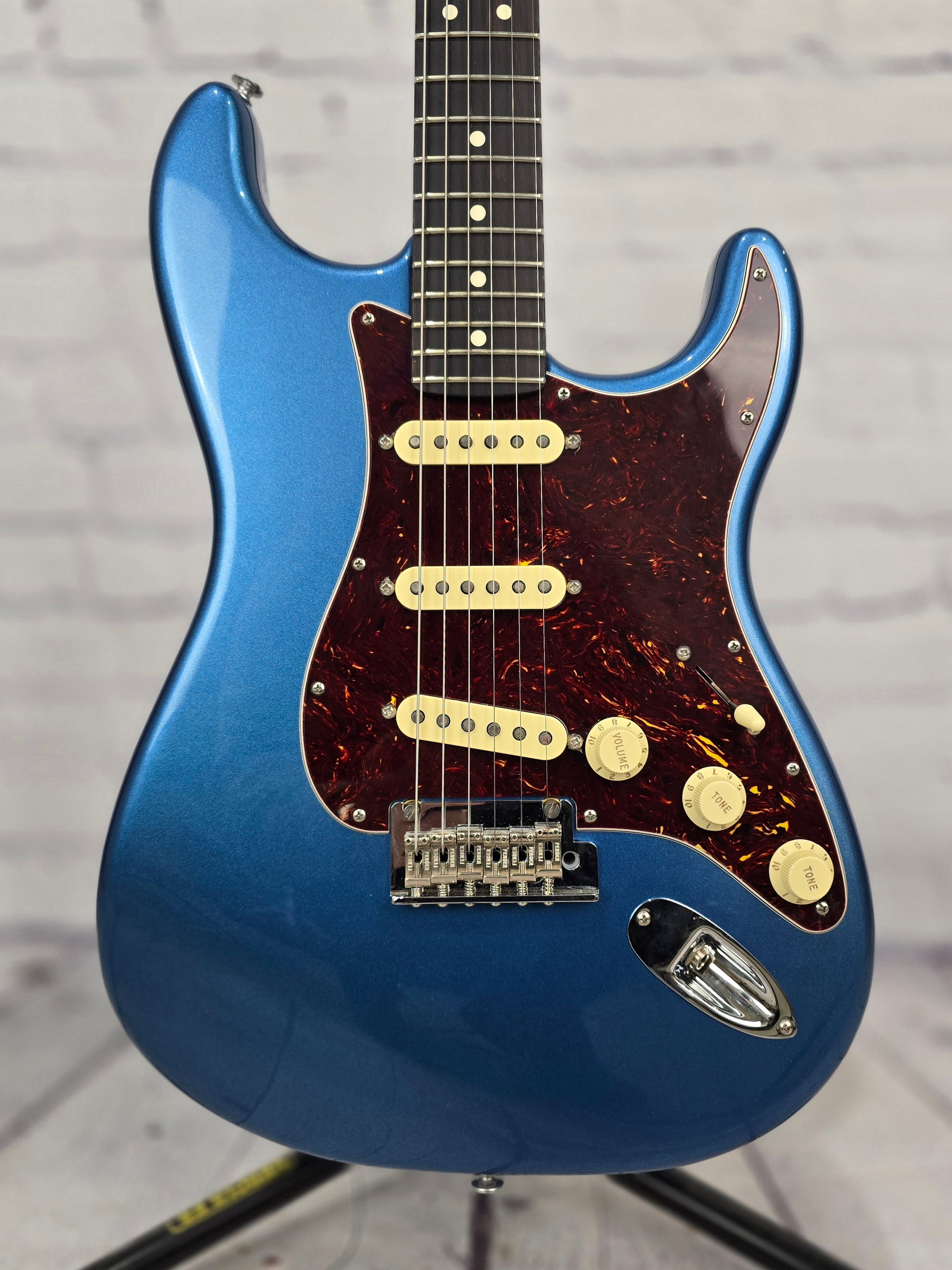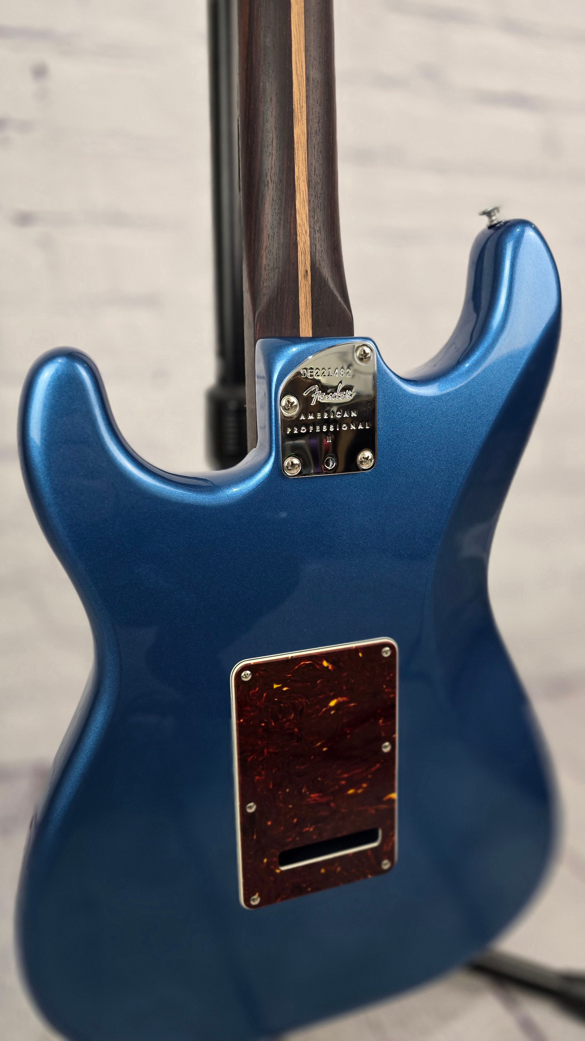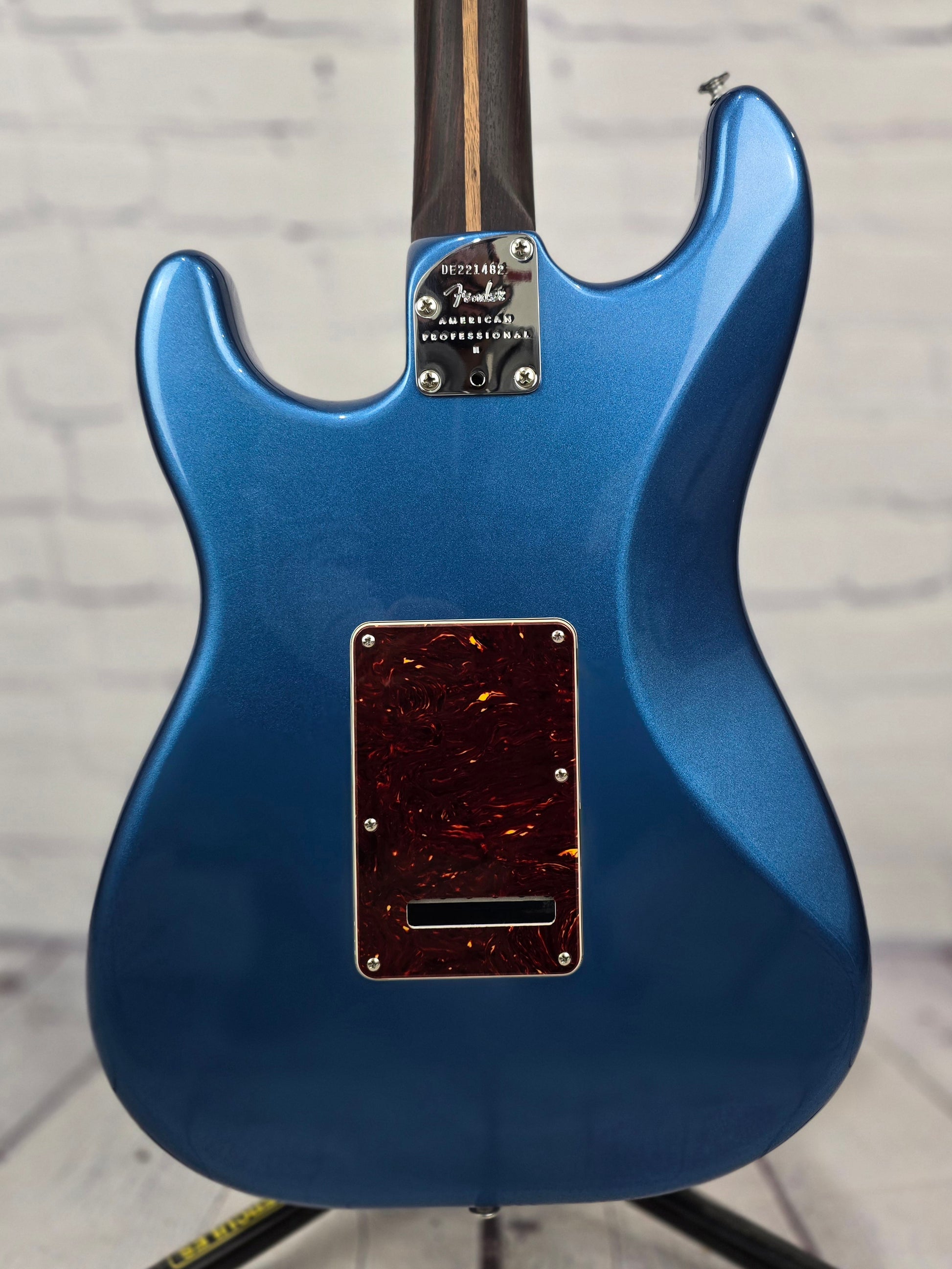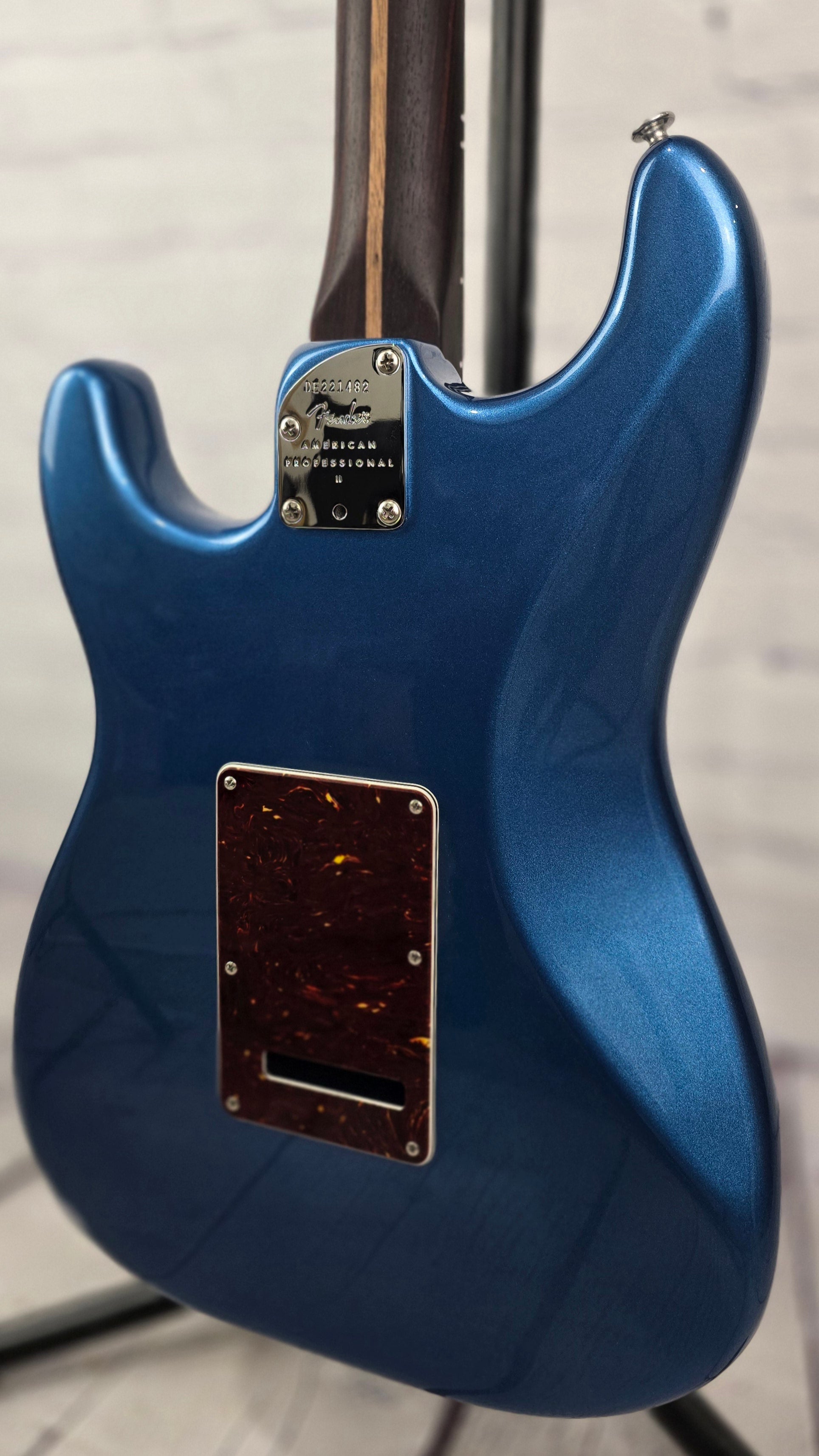 Just in @ Guitar Brando - very clean USA built American Professional II Stratocaster with gorgeous, deep colored rosewood neck and fretboard. This dark rosewood neck contrasts beautifully with the gorgeous Lake Placid Blue finish and tortoise pickguard.