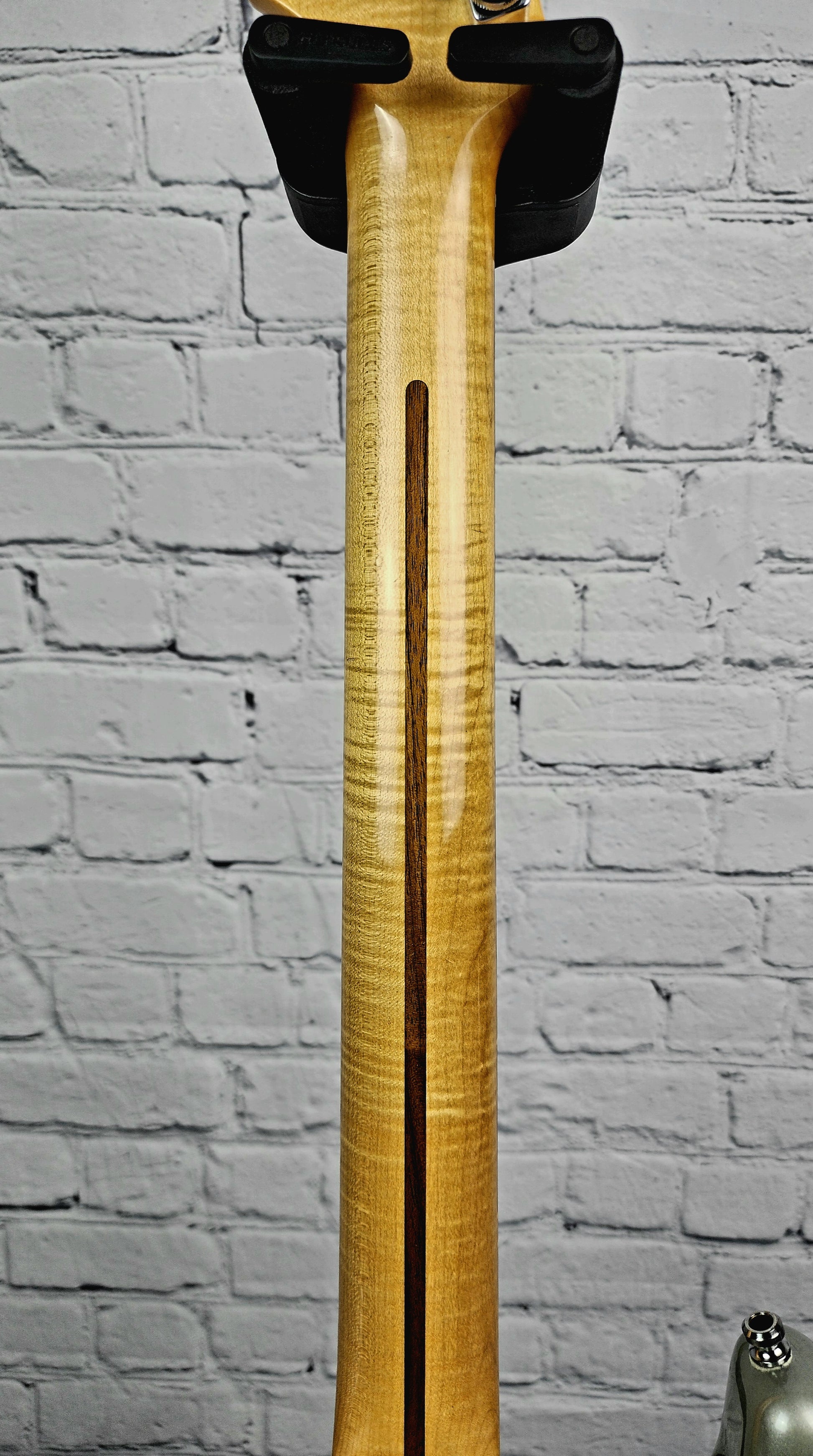 The alder body, maple neck and rosewood board are all Fender staples, but this model features a gorgeous figured curly maple neck, showcasing the Custom Shop build quality, plus the '09 Deluxe models all featured 22 frets, 6105 taller frets, 9.5 radius, 2 point tremolo and locking tuners. Locking tuners have been further upgraded from the Fender/Schaller to Hipshot USA (originals come with the guitar).