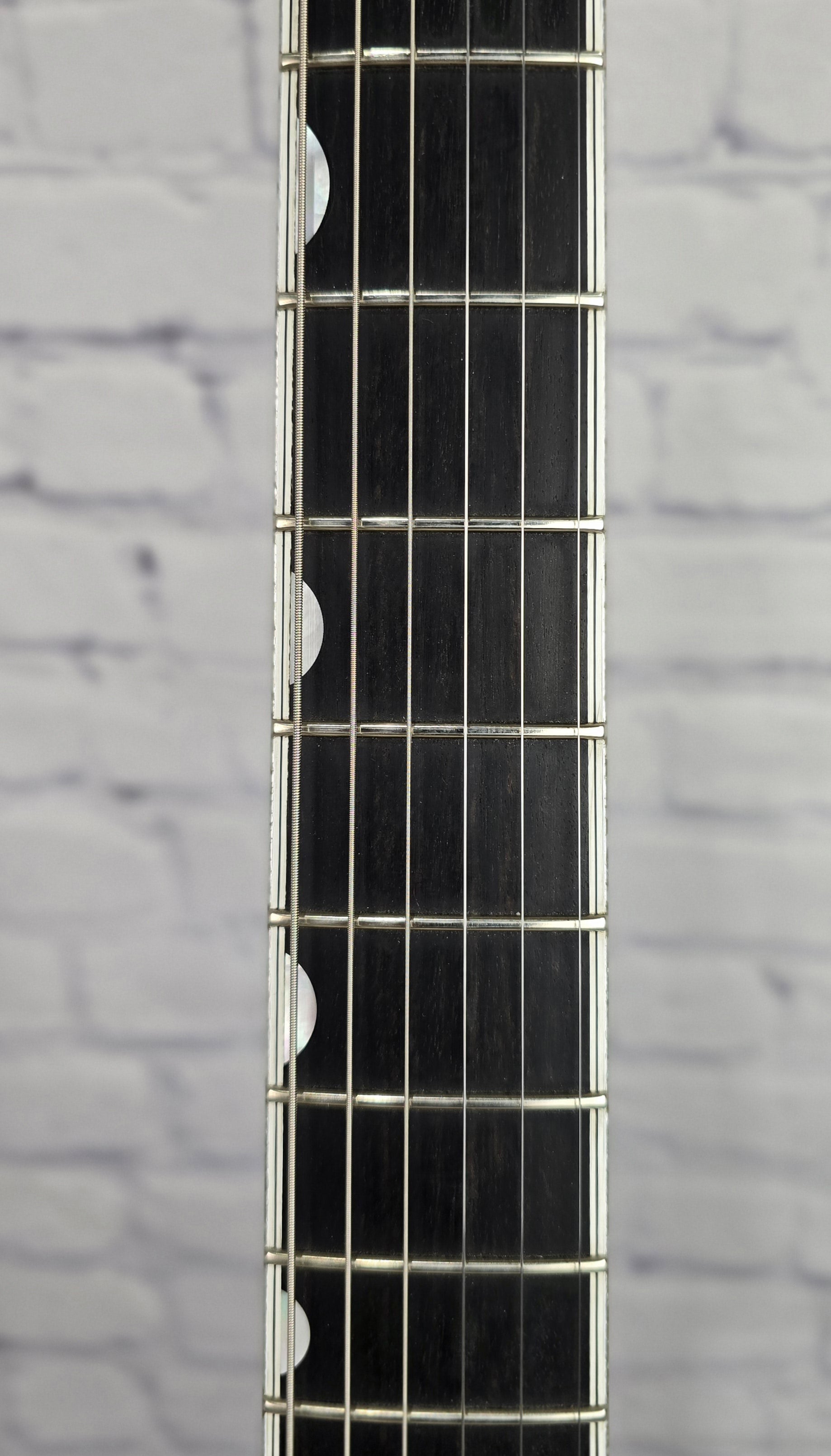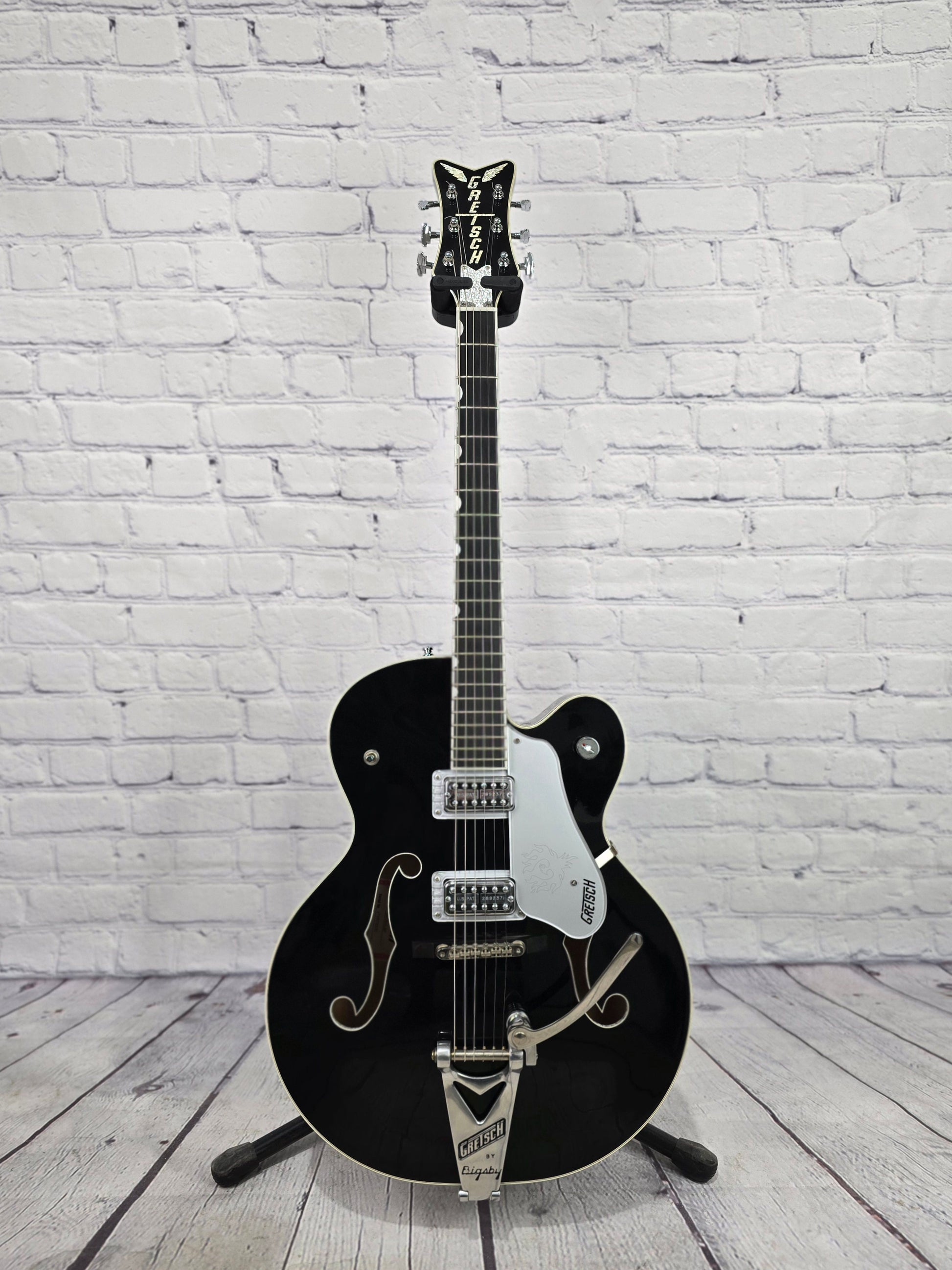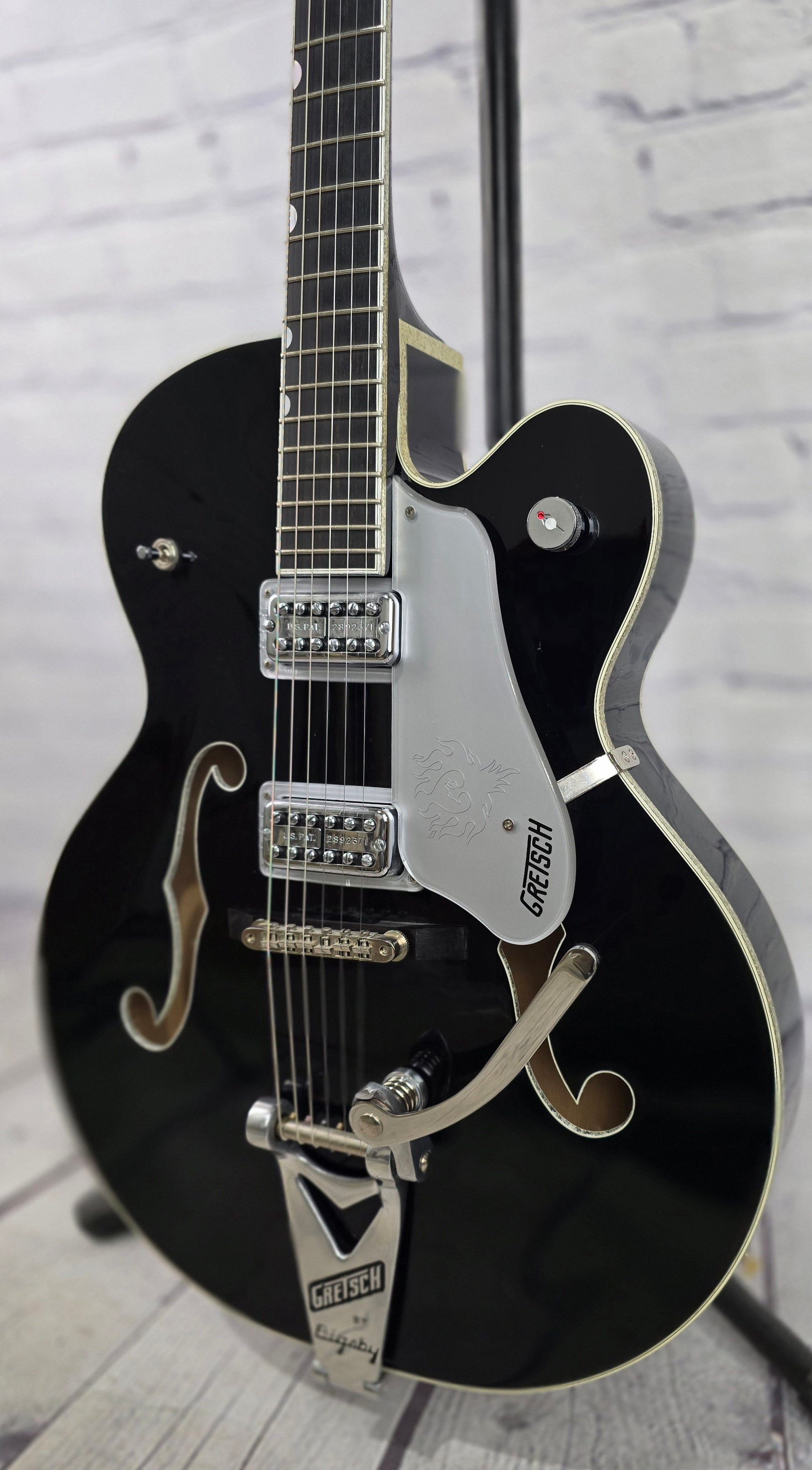 Stripped down and hot-rodded, the G6136SLBP Brian Setzer Black Phoenix is designed and built for speed. The single-cutaway hollow body has an arched top, 1959 trestle bracing and f holes; the two-piece maple neck has an ebony fingerboard with mother-of-pearl Neo-Classic thumbnail inlays. Other features include TV Jones Classic pickups, three-position pickup switch, jeweled single master volume control, silver-sparkle binding (body, fingerboard and headstock), silver plexi pickguard with Phoenix engraving, Schaller strap locks, Grover Imperial tuners, pinned Adjusto-Matic bridge, Bigsby B6C vibrato tailpiece and gloss black nitrocellulose lacquer finish.