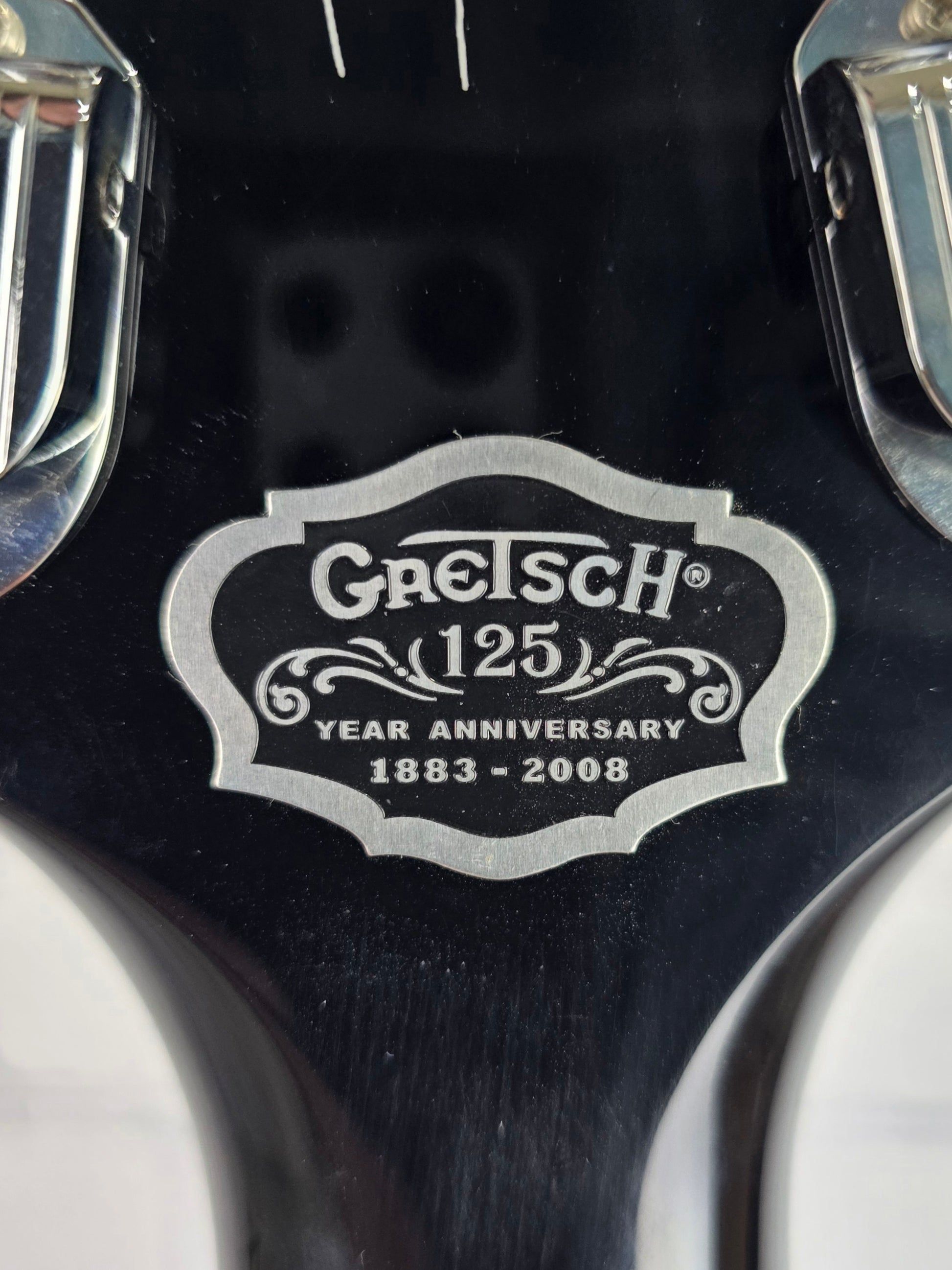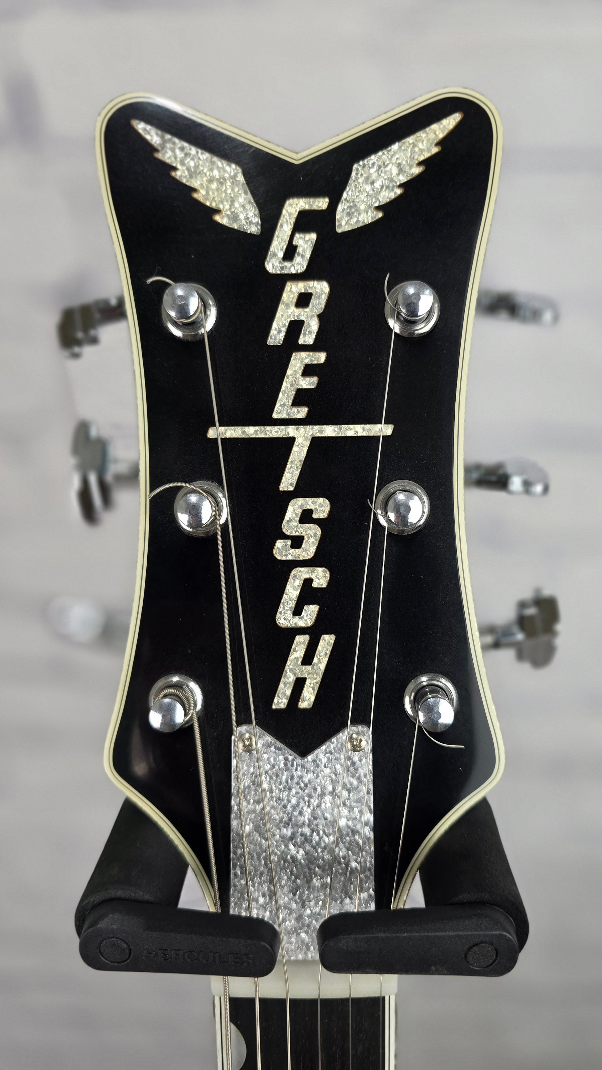 Unique Features: V-Shaped Falcon Headstock with Winged Vertical Gretsch Logo, Mother-of-Pearl Neo Classic "Thumbnail" Inlay Position Markers, Silver Sparkle Bound Fingerboard an Headstock, Multiple Silver Sparkle Body Bindings, Silver Plexi Pickguard, Delrin Nut, 1959 Style Trestle Bracing, Jeweled Knobs, Schaller Straplocks, Adjustable Truss Rod with Silver Sparkle Cover