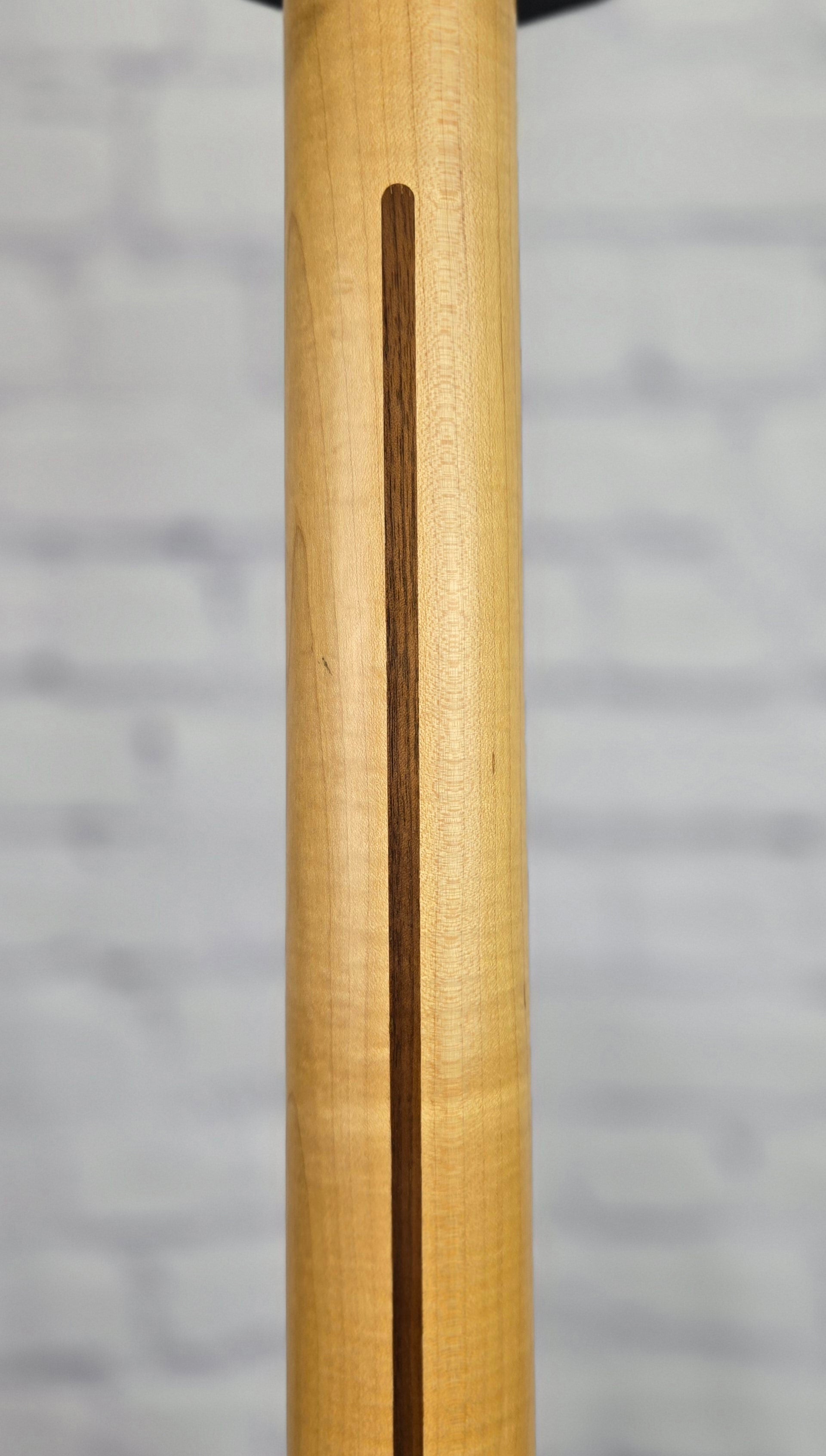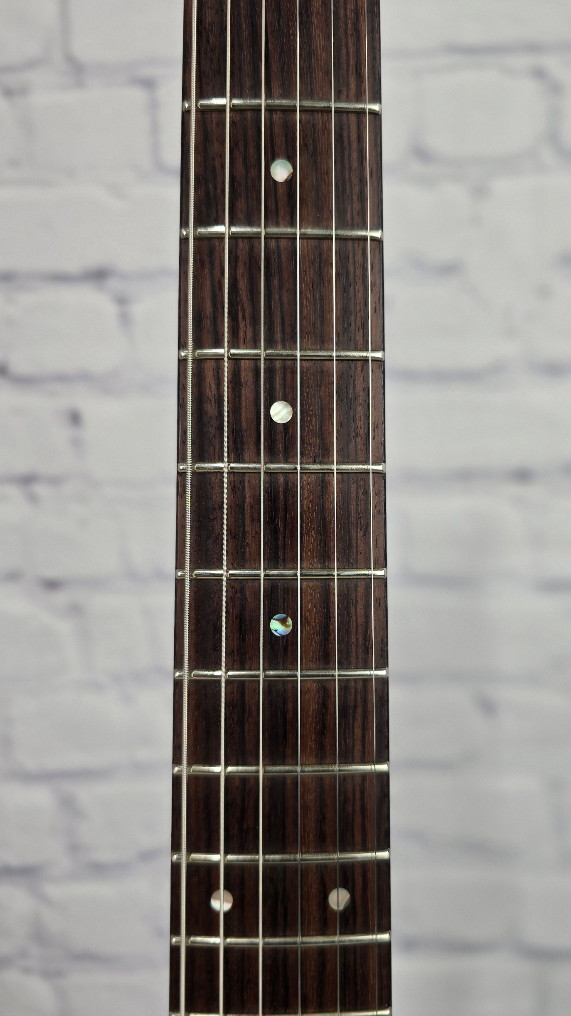 It features a mahogany body bolted to a maple neck with a 22-fret rosewood fingerboard with abalone dot position markers. Components include a pair of DiMarzio JS humbuckers and a Gotoh GTC101 fixed bridge.