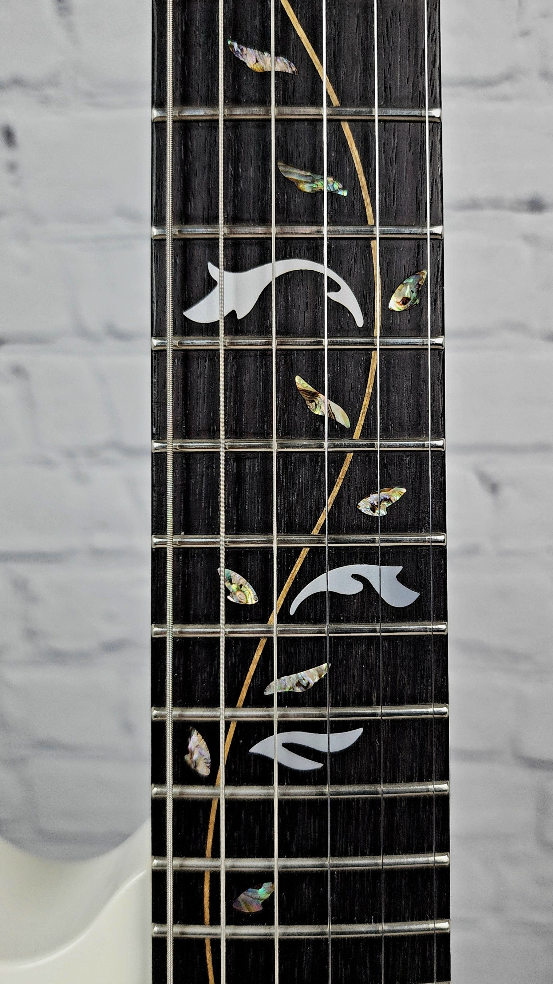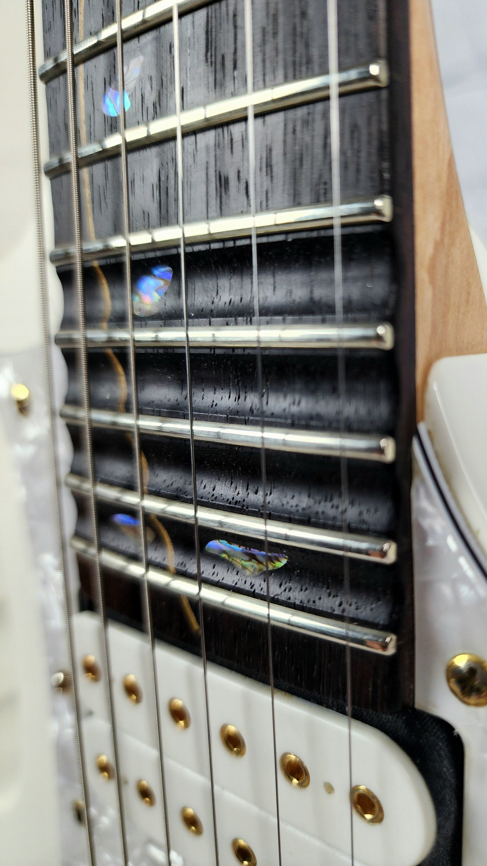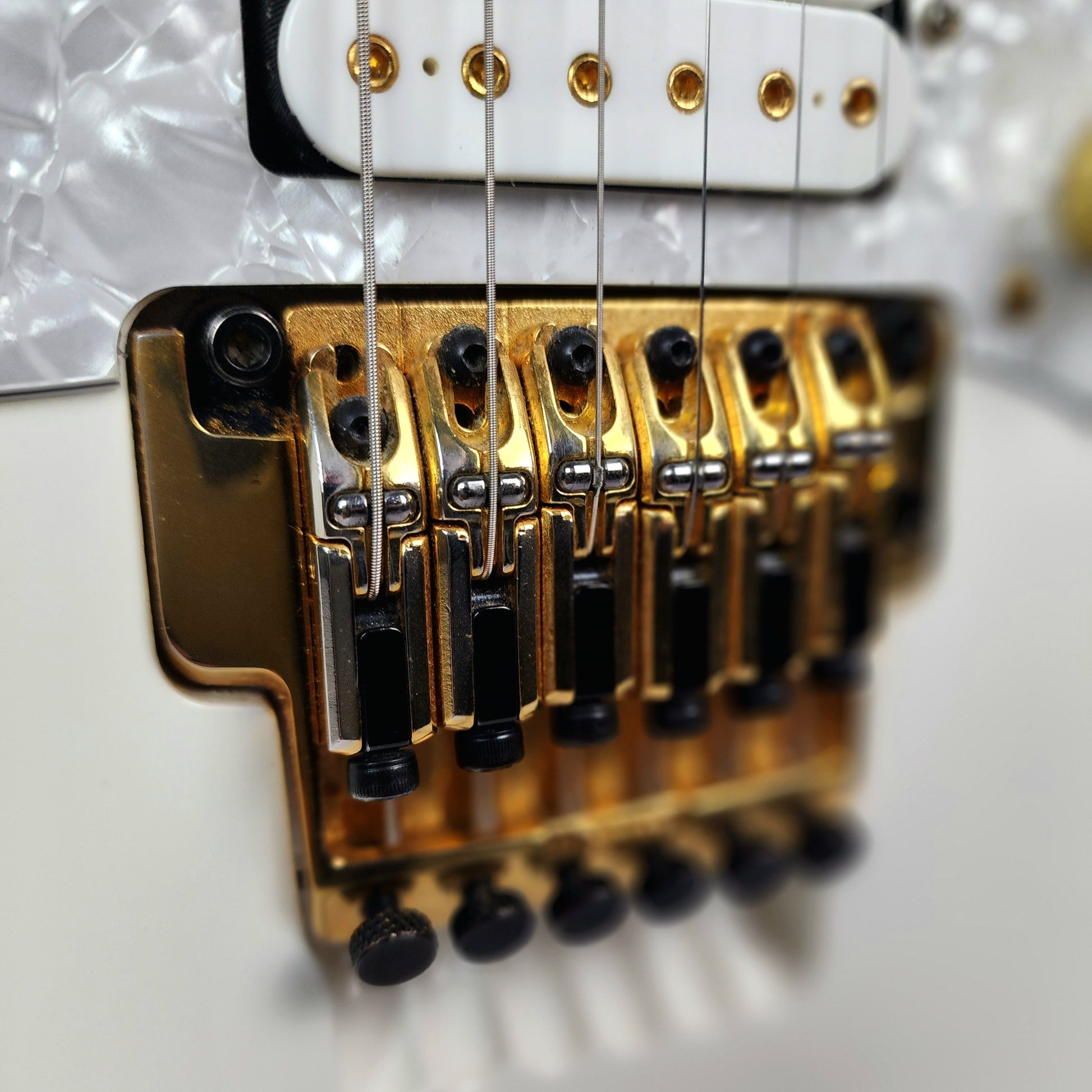 Frets are in good shape, but could use a polish, no significant wear. Edge Pro trem (era correct) is in good operating condition and holds tune well. The action is set up to play extreme quickly.