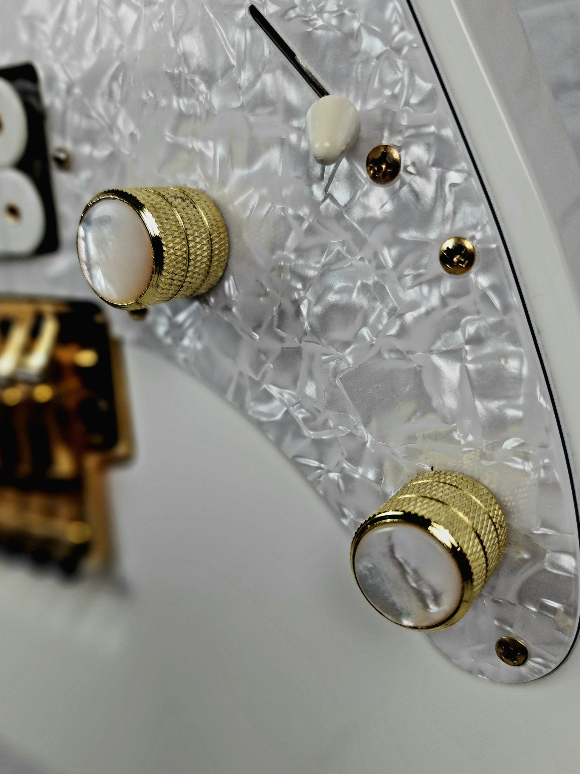 The JEM7V features an alder body bolted to a maple and walnut neck with a 24-fret fingerboard with pearl and abalone Tree of Life vine inlays. Components include DiMarzio Evolution pickups with a pair of humbuckers flanking a single-coil, a Edge Pro bridge and Gotoh tuning machines. A thin basswood veneer is applied to the top and back of the body to prevent the finish from soaking into the alder and preventing the alder grain from appearing through the finish. The fingerboard is scalloped at the last four frets.