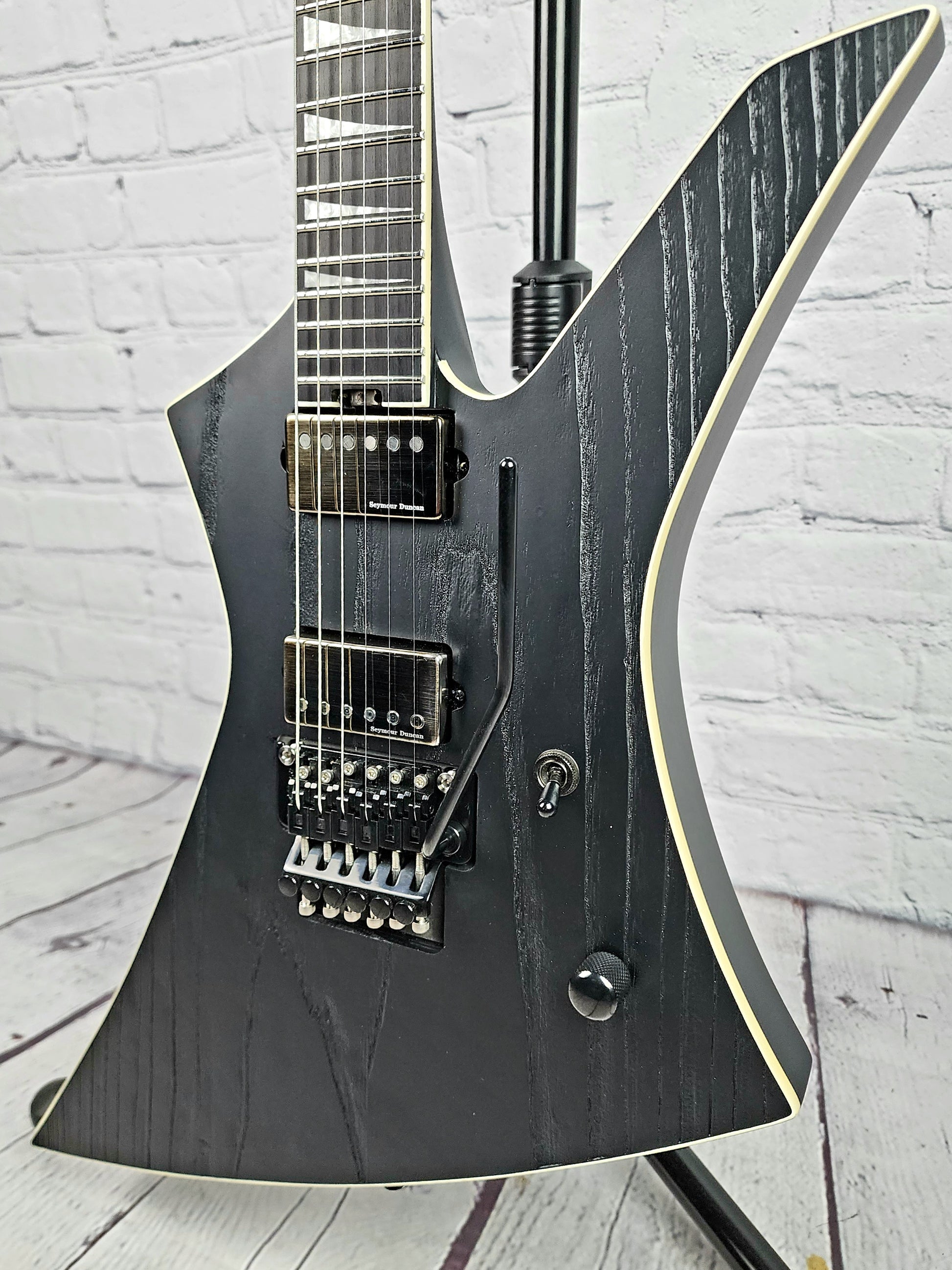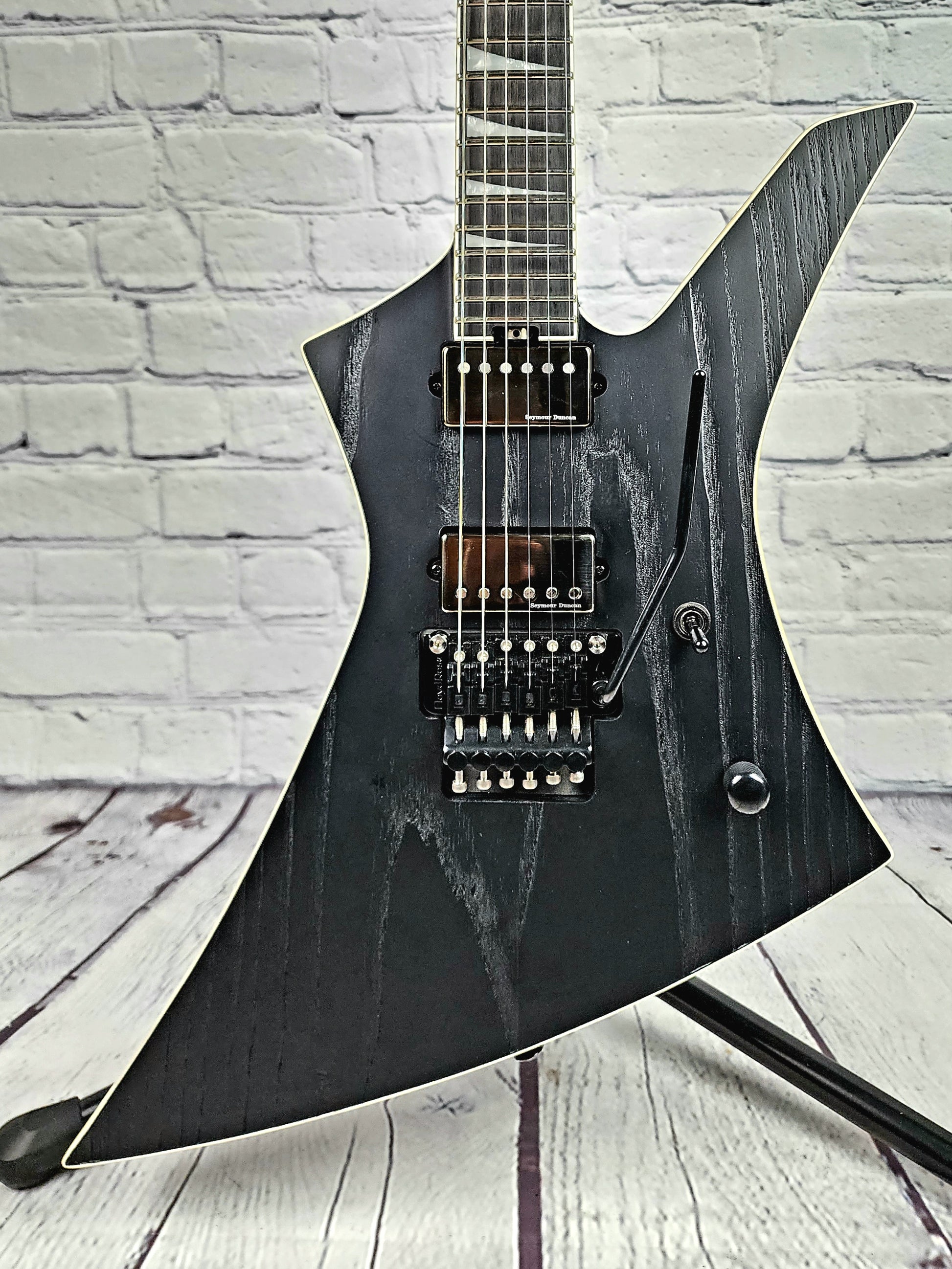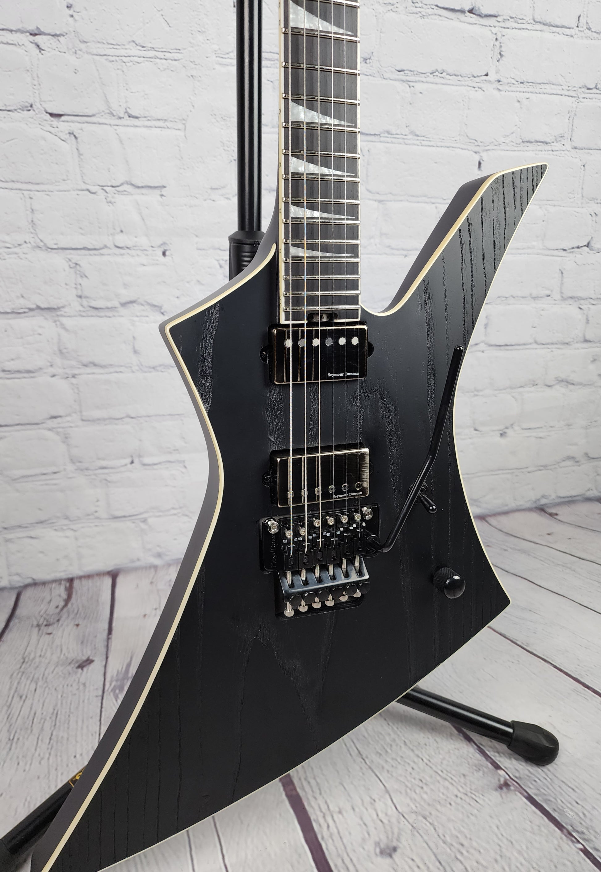 This aggressive signature axe features a poplar body with a sandblasted ash top finished in Black with white binding for a distressed and menacing look. Through-body maple neck construction creates grater sustain and includes graphite reinforcement for the utmost stability against the rigors and ravages of the road. Shaped for speed, its bound 12"-16" compound radius ebony fingerboard hosts 24 jumbo frets and stylish pearloid sharkfin inlays. Luminlay® side dots will help you find your way along the fretboard even on the darkest of metal stages, while a heel-mount truss rod adjustment wheel makes for quick and painless neck relief tweaks.