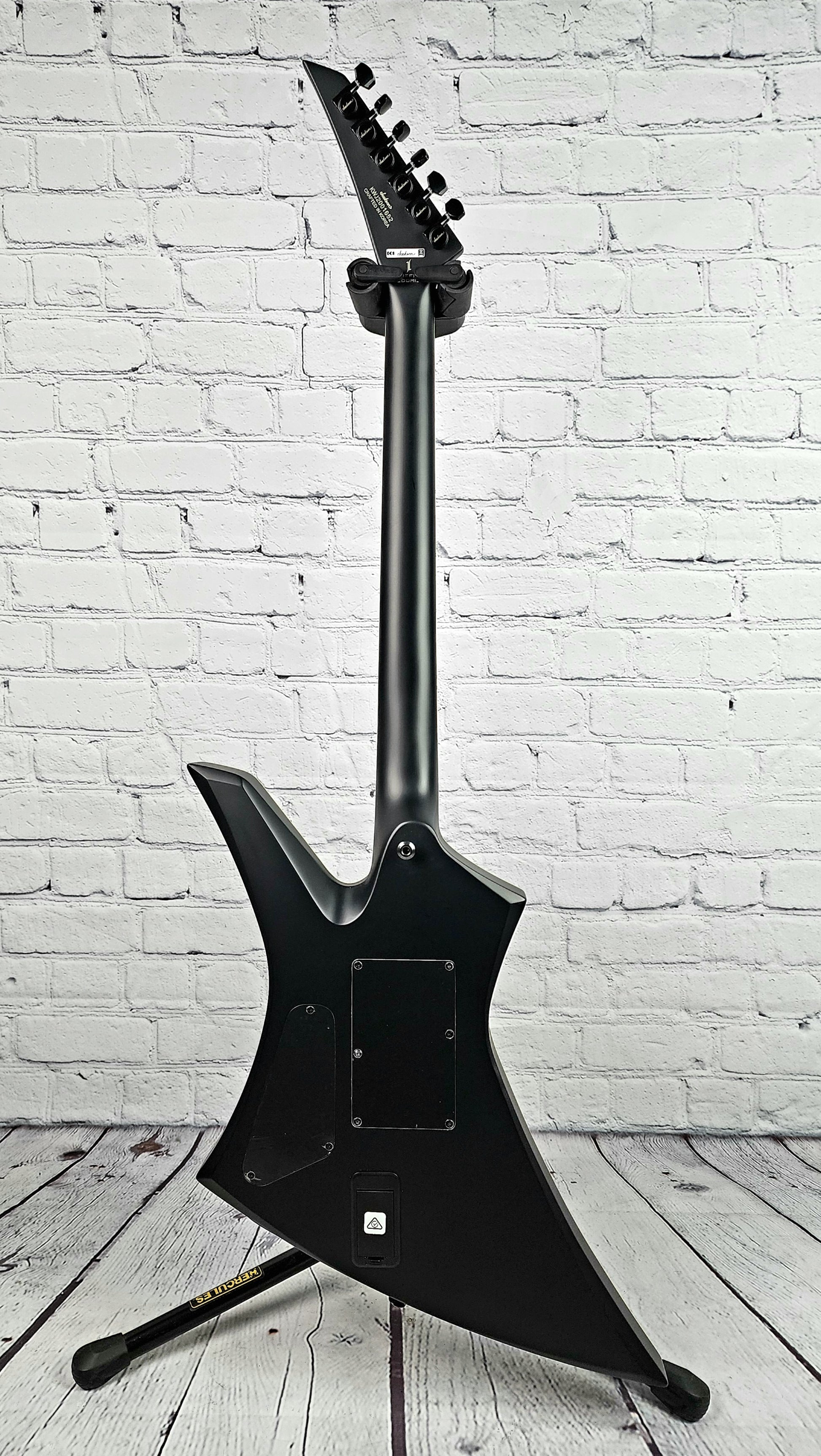 This metal behemoth's other premium features include a single volume control, three-way toggle switch, Floyd Rose® 1500 Series double-locking tremolo bridge system, heel-mount truss rod adjustment wheel, Jackson die-cast tuners, Jackson's famed pointy tilt-back headstock and black hardware.
