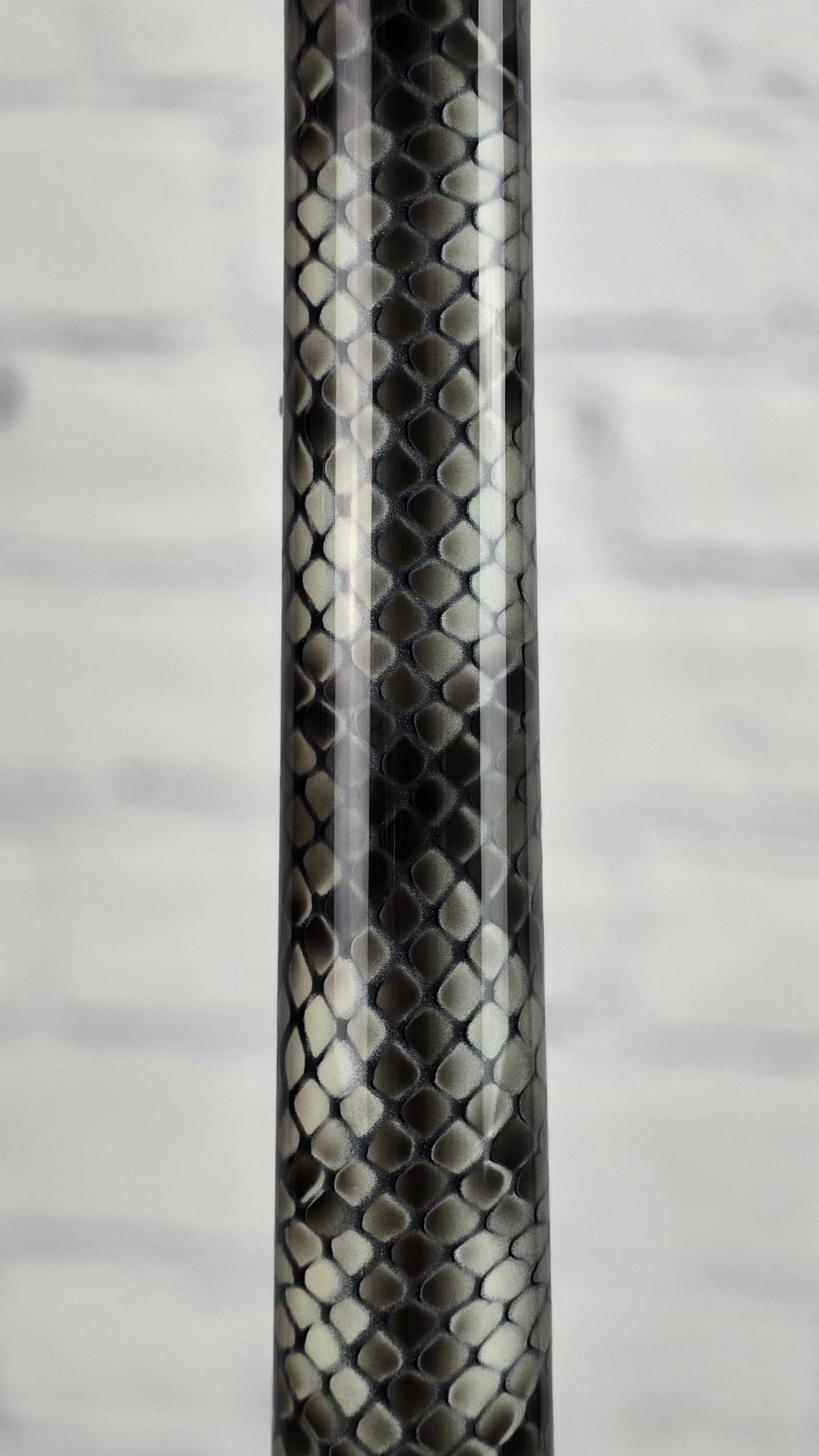Jackson USA SL2H Soloist in Snakeskin finish made in 2002. This guitar features an alder body, maple neck-thru and a bound ebony fingerboard. Equipped with a Seymour Duncan TB4 in the bridge position and a JB in the neck controlled by a master volume and master tone control with a 3-way pickup selector switch. The 25.5” scale length neck has 24 jumbo frets with mother of pearl shark fin inlays that match the mother of pearl “Jackson” headstock logo. Black hardware with an original Floyd Rose locking tremolo with locking nut, Gotoh tuning machines and black dome knobs.
