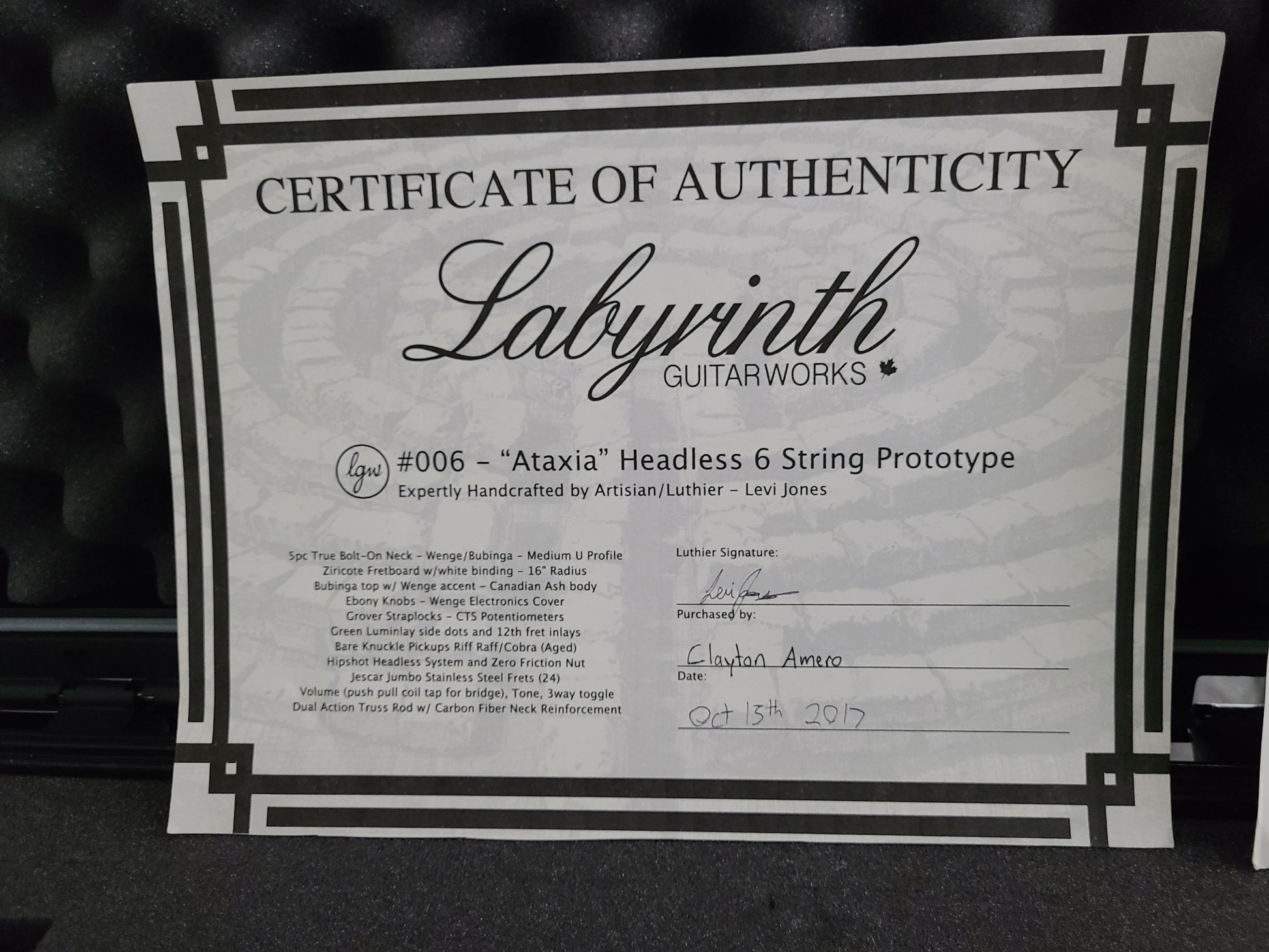 Just in!! Pre-owned Labyrinth Ataxia 6 String. Canadian built with very high specs. This guitar is a one-owner unit and it does show some signs of wear, but overall it is in very good condition and plays very well.