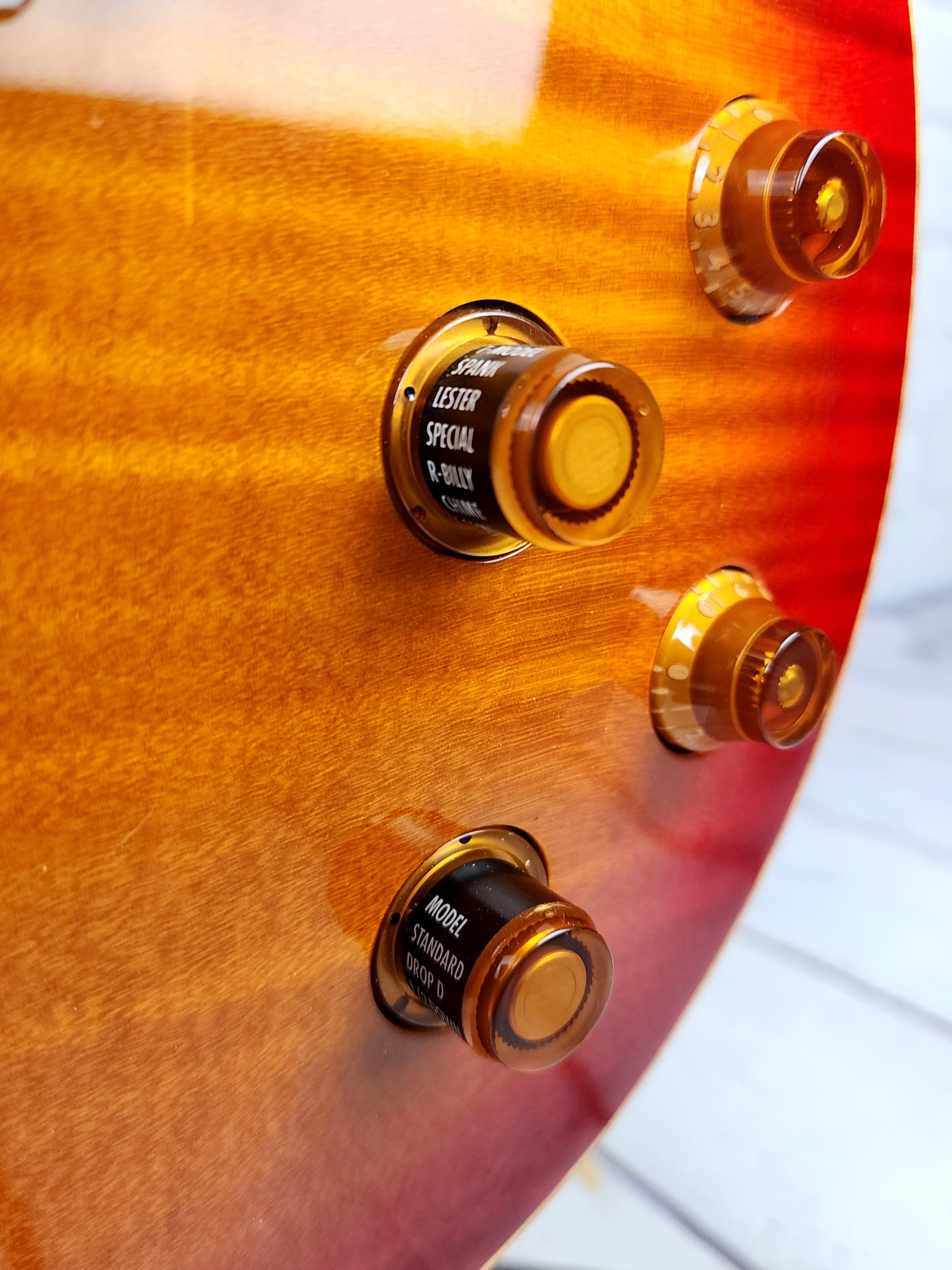 Mahogany body with carved maple top with flame maple veneer