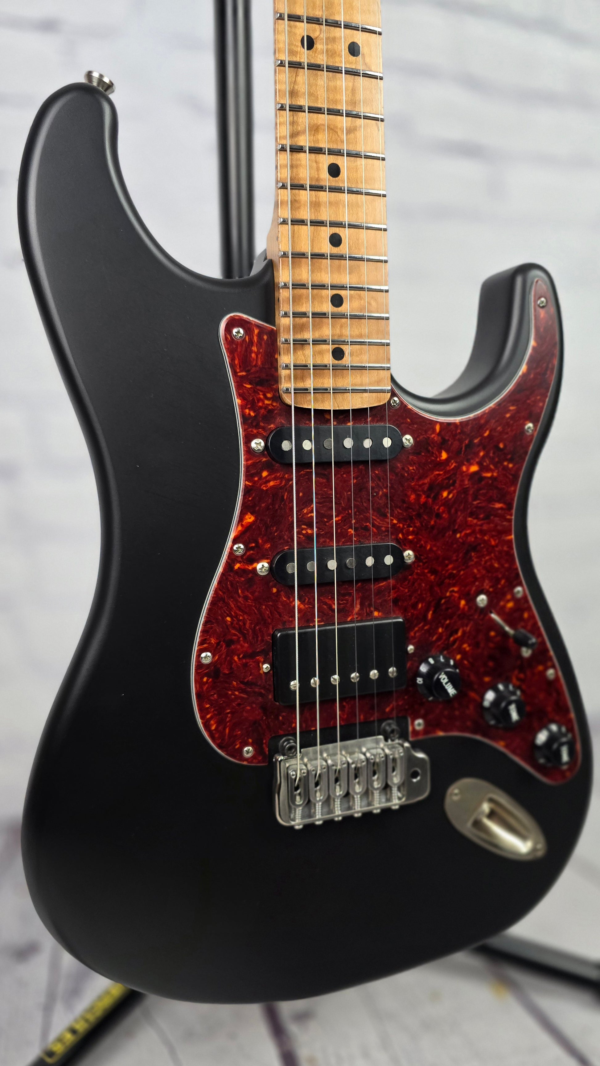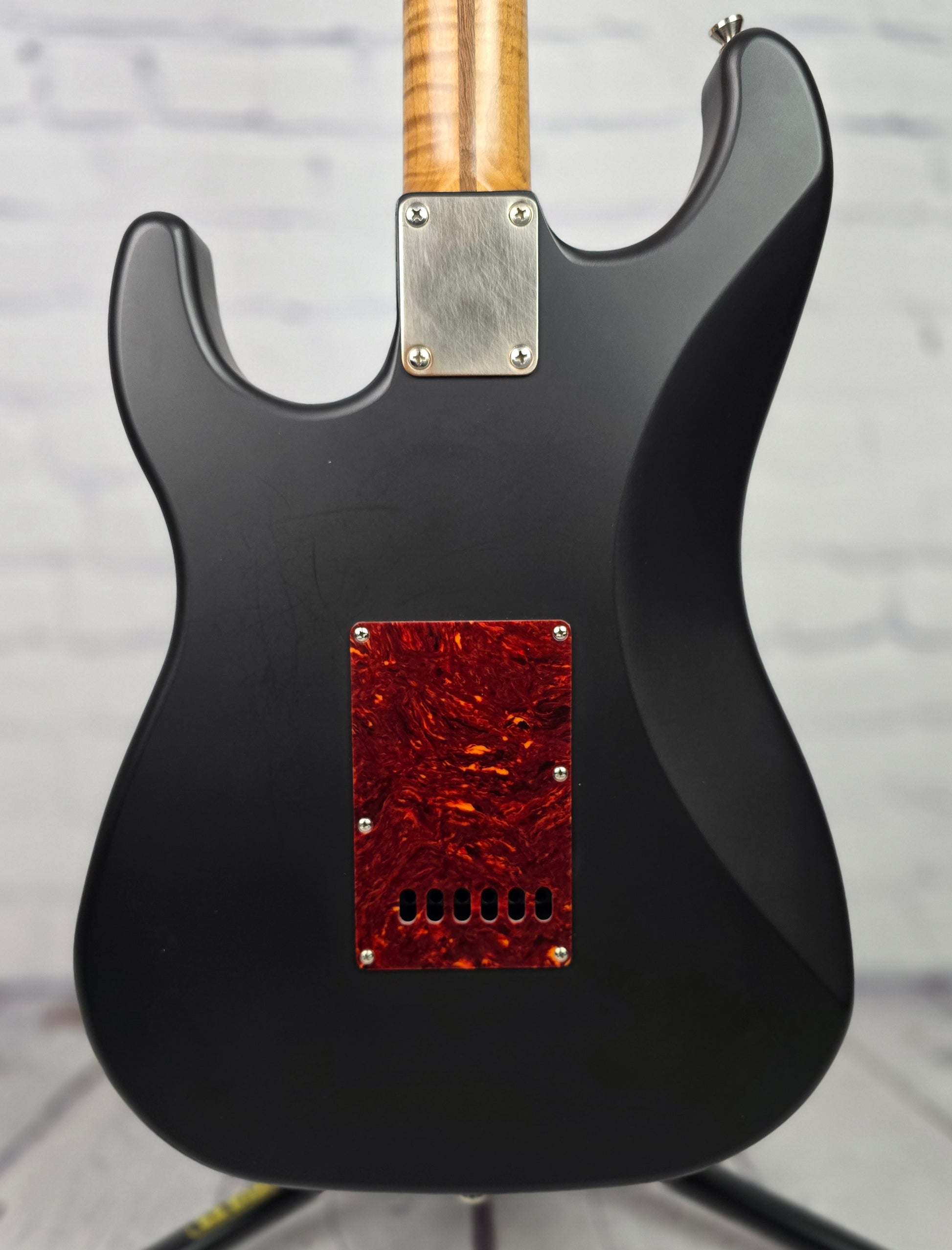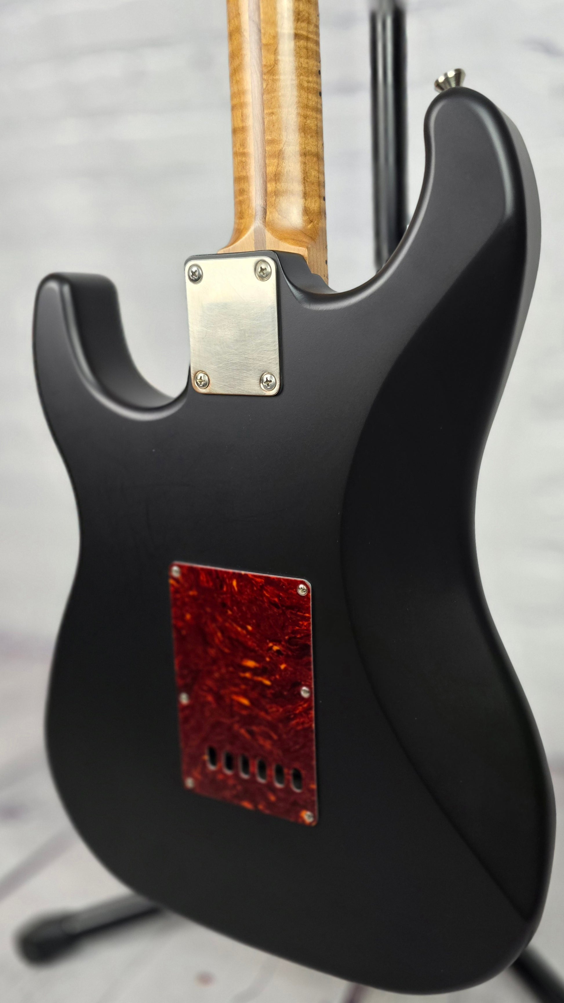 Matte black thin skin nitro finish is loud and resonant and the handwound pickups are dynamic and robust. The star of the show here is the effortlessly playable roasted maple neck, figured in such a deep and unique grain pattern