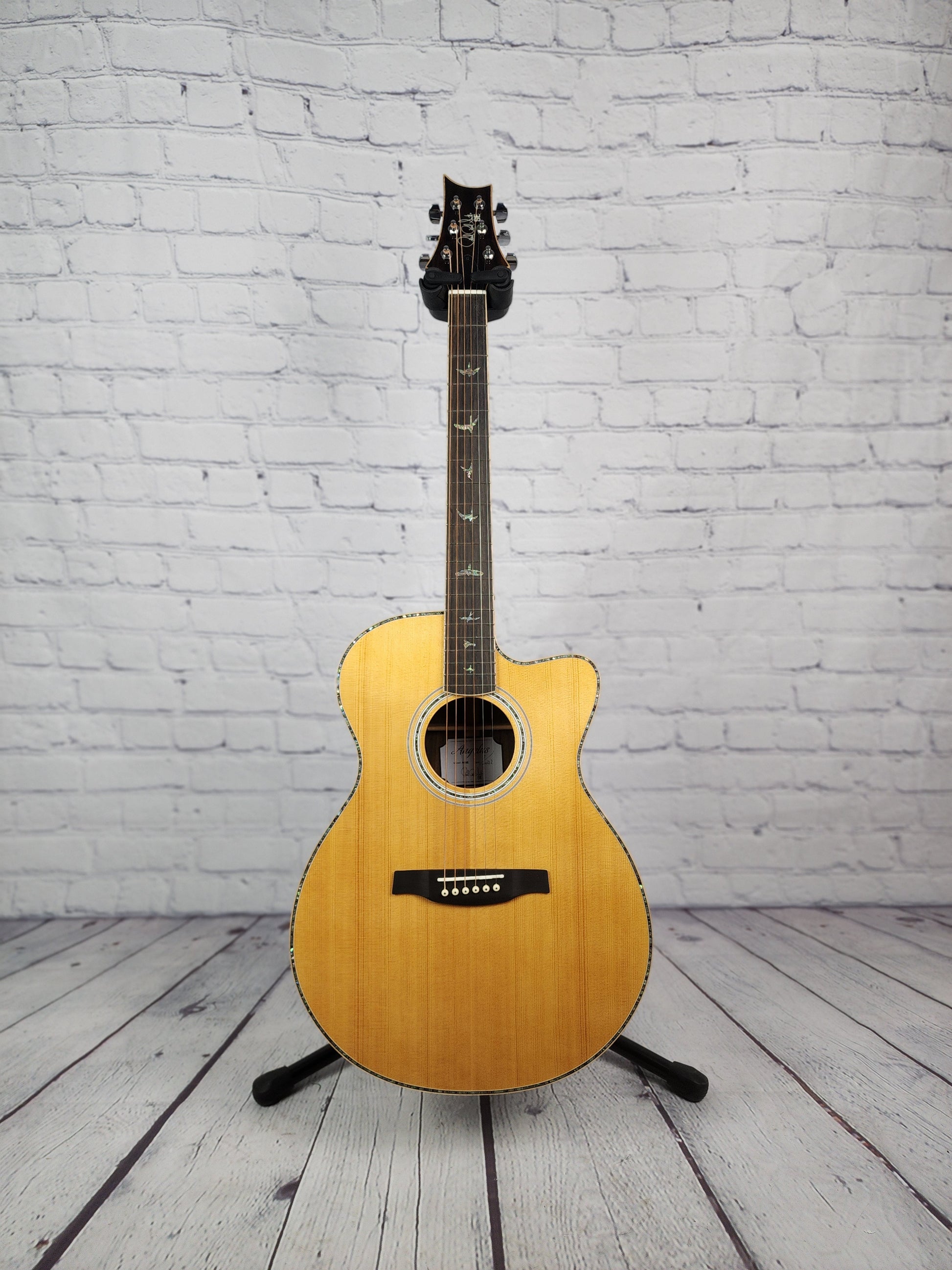 The SE A60E is beautifully appointed with abalone and figured maple accents. Additional high-quality features include a solid spruce top, ebony fretboard and bridge, bone nut and saddle, as well as PRS trademark bird inlays and headstock design. Ships with a high-quality hardshell case.