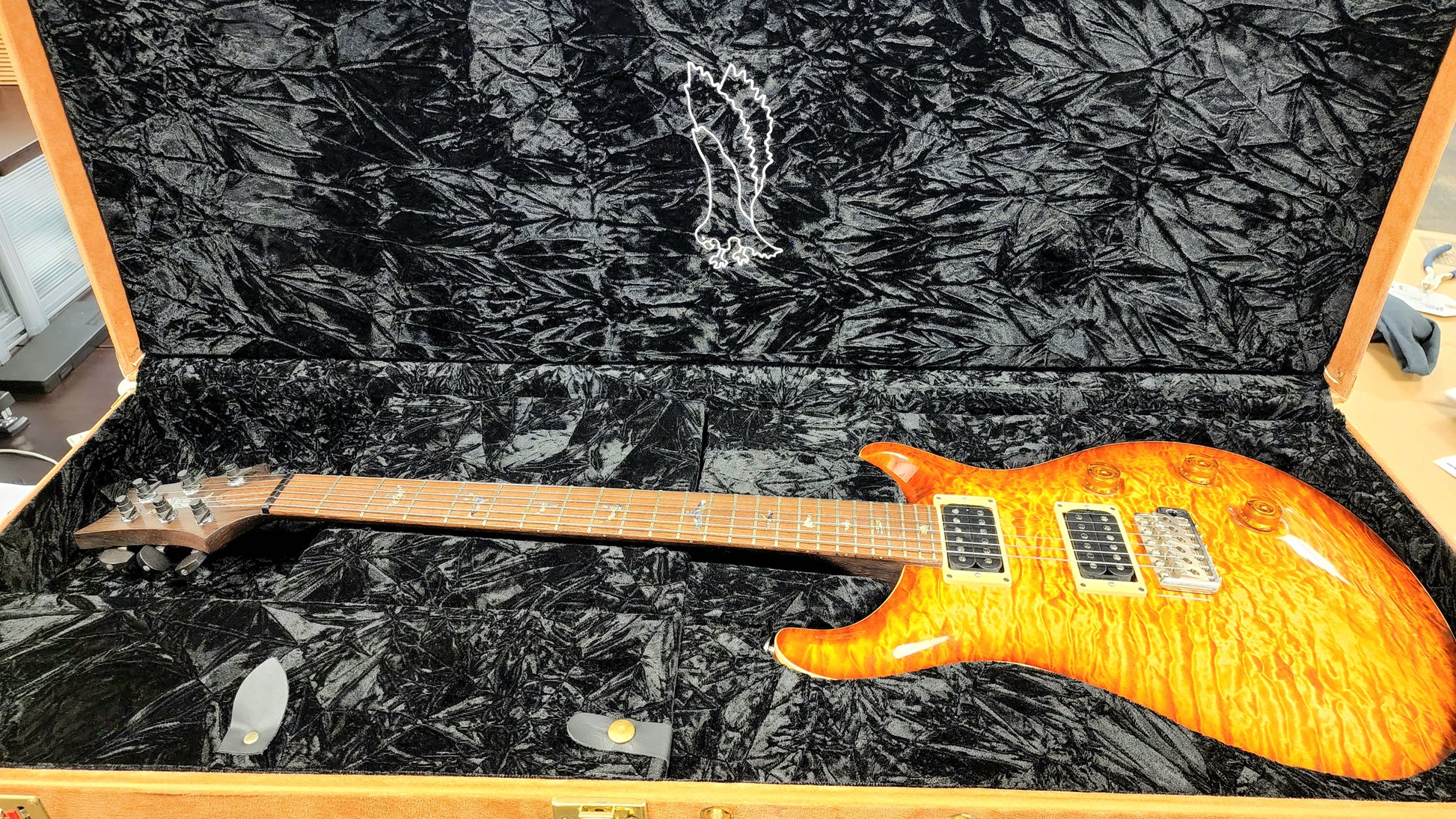 This PRS Private Stock guitar also features the standard 10" fretboard radius, gorgeous abalone inlays, PRS Phase I locking tuners, 5 way rotary switching, rosewood truss rod cover and the incredible Private Stock suede hardshell case.