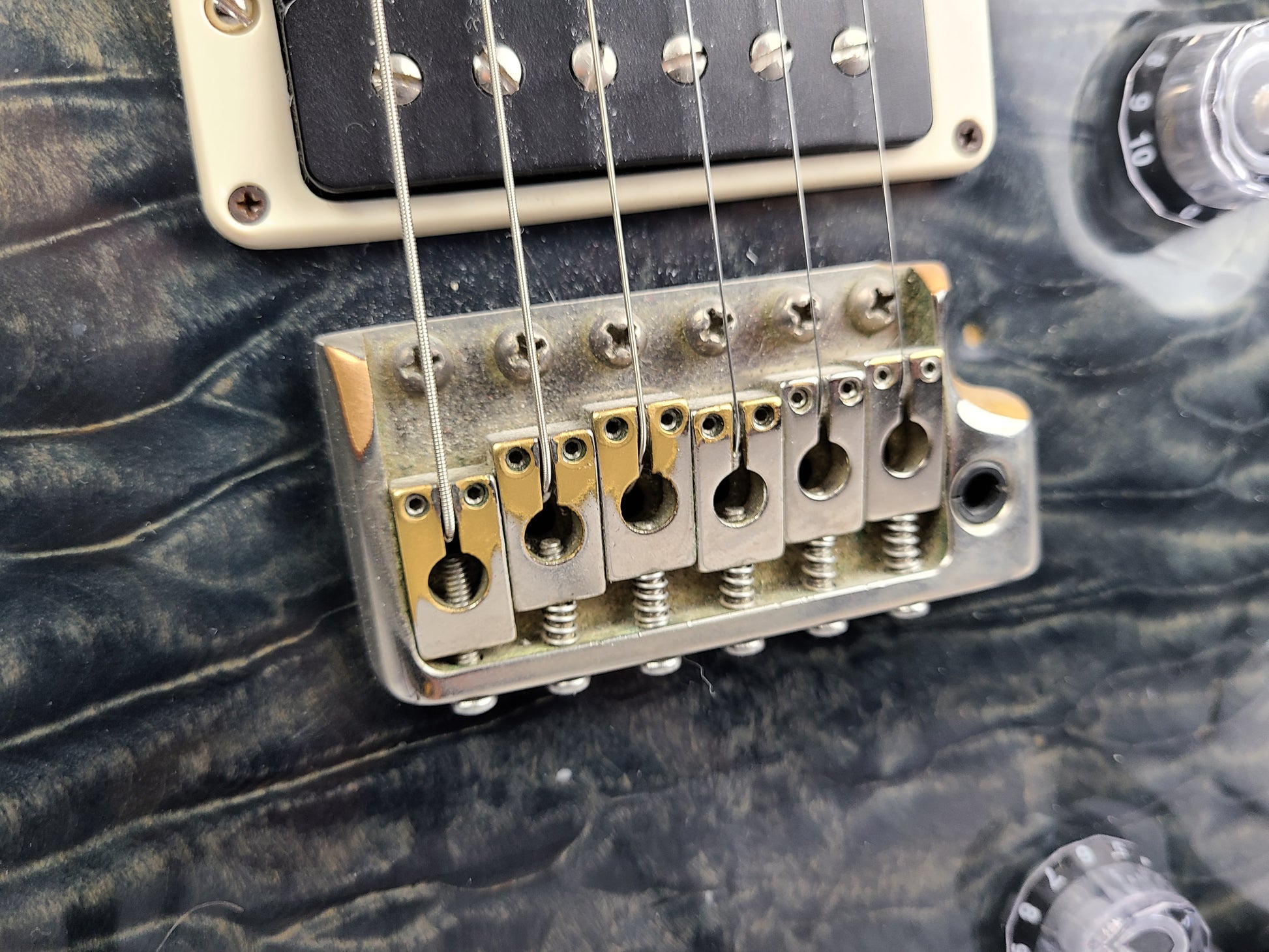 This one is player's grade - not a case queen by any metric - but it plays incredibly. It has been resto-modded to incorporate newer PRS design into the older model. The pickups and rings were replaced with PRS \m/ Metal set and new style rings (countersunk screws). The knobs were updated to lampshade style and the pickup selector (previously a 5 way) was removed for a push/pull tone and a mini-toggle pickup selector has replaced the sweet switch.