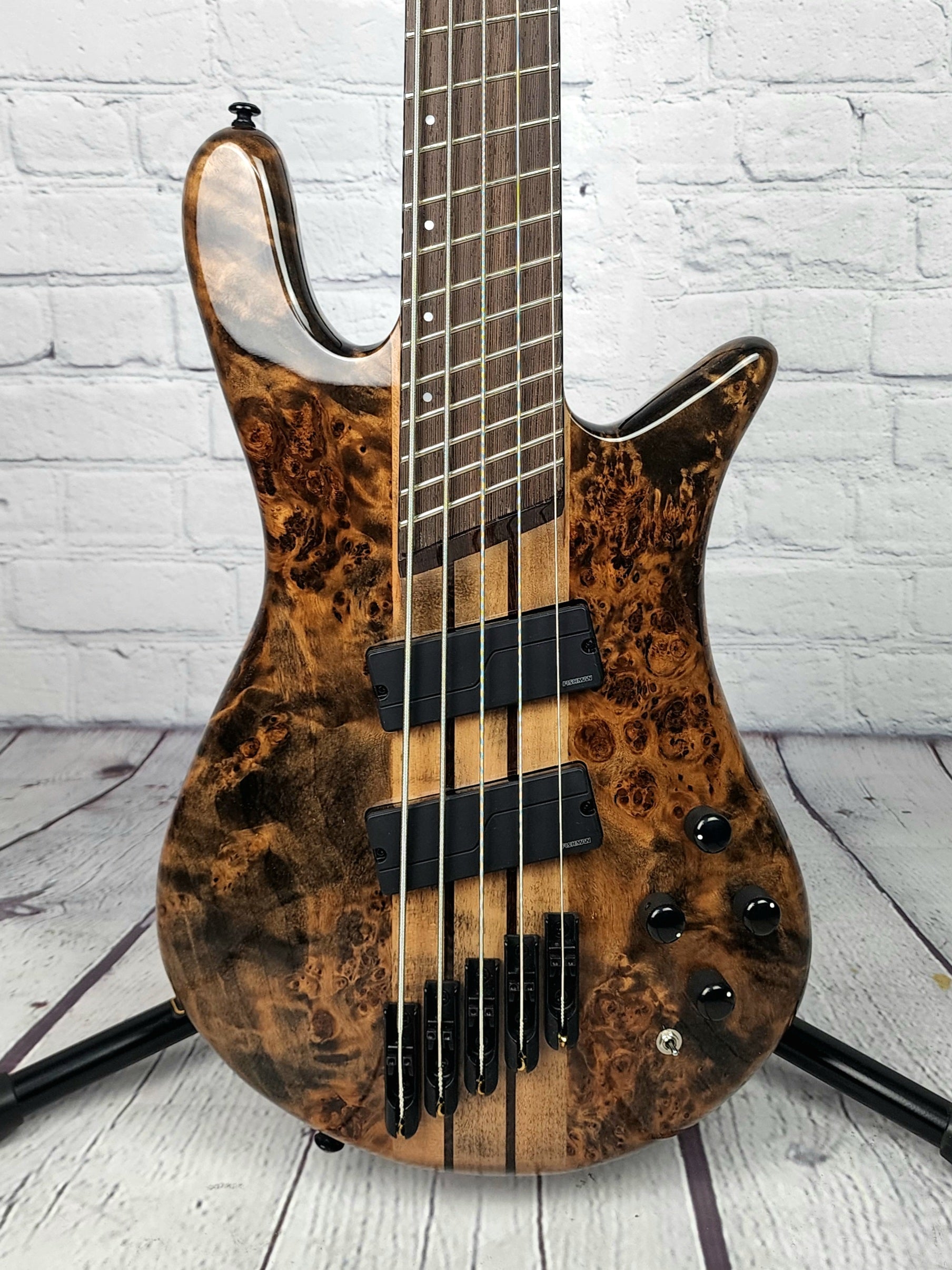 Spector’s NS Dimension Series combines iconic design with multi-scale construction, bringing a new level of playability and tonality to Spector’s dedicated legion of players. In addition to the multi-scale, neck-thru construction, the NS Dimension features a variety of premium tonewoods and cutting-edge Fishman Fluence electronics. The fully curved body is carved from lightweight Swamp Ash and features a highly figured Poplar Burl top. The 5-piece neck is constructed from Maple and Wenge for enhanced stability and eye-catching looks. The 24 fret Wenge fingerboard also features illuminating side dots, allowing players to expertly navigate the fingerboard. NS Dimension basses are available in two distinct finishes, Haunted Moss Matte and Super Faded Black Gloss.