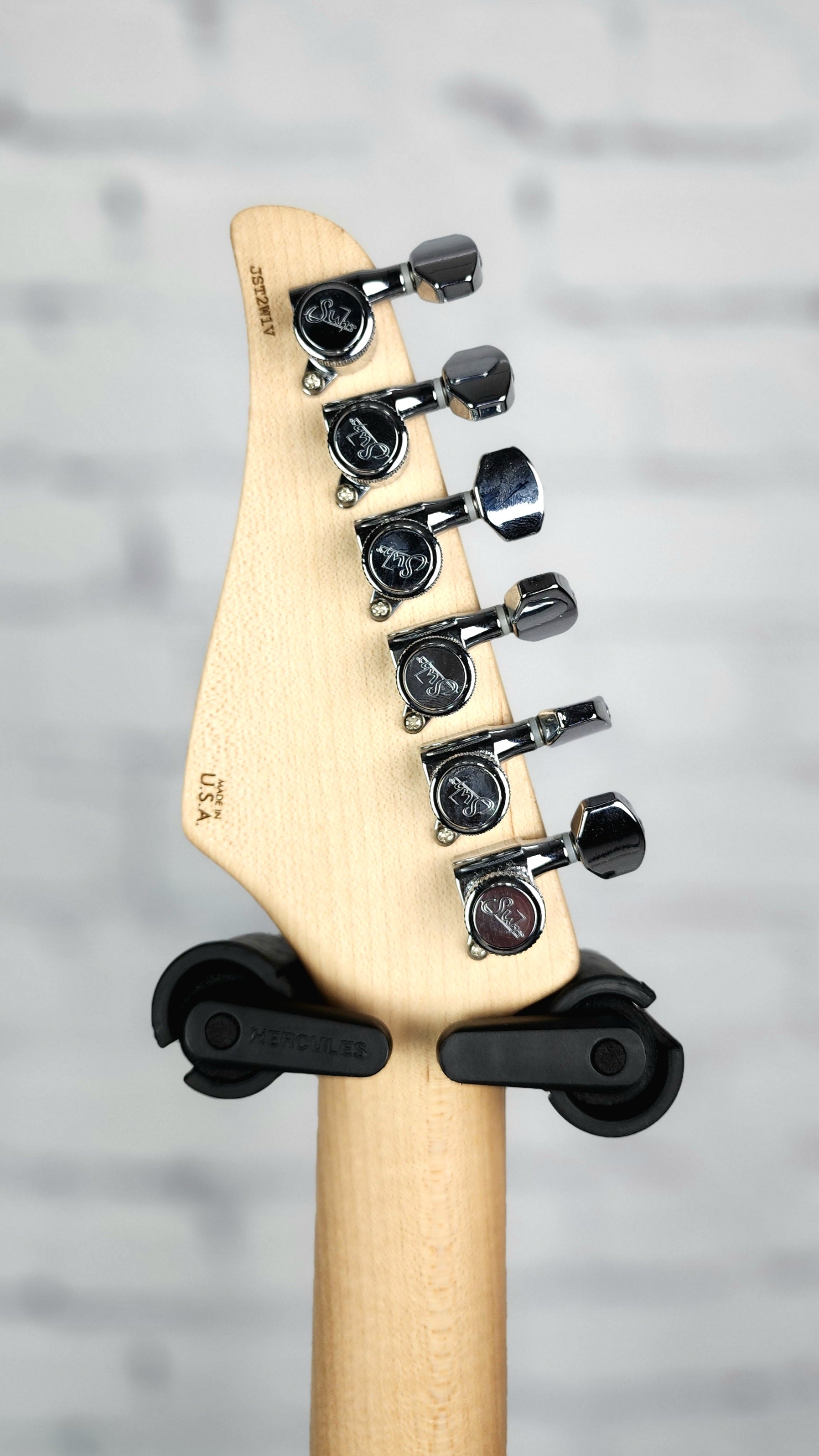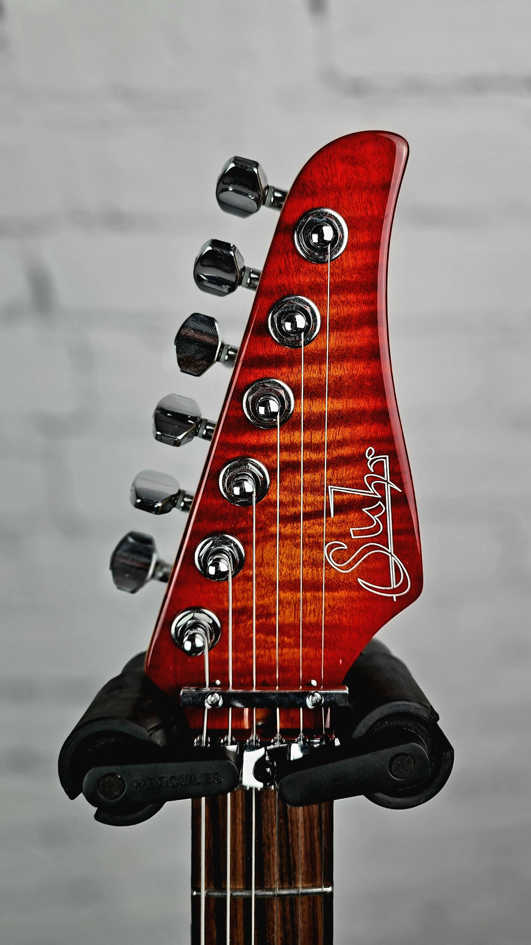 Suhr Modern features a sleek elliptical neck profile, balanced asymmetrical body, innovative neck heel and stunning flame maple top. Proprietary Suhr locking tuners and the Gotoh Floyd Rose tremolo provides superior tuning stability.