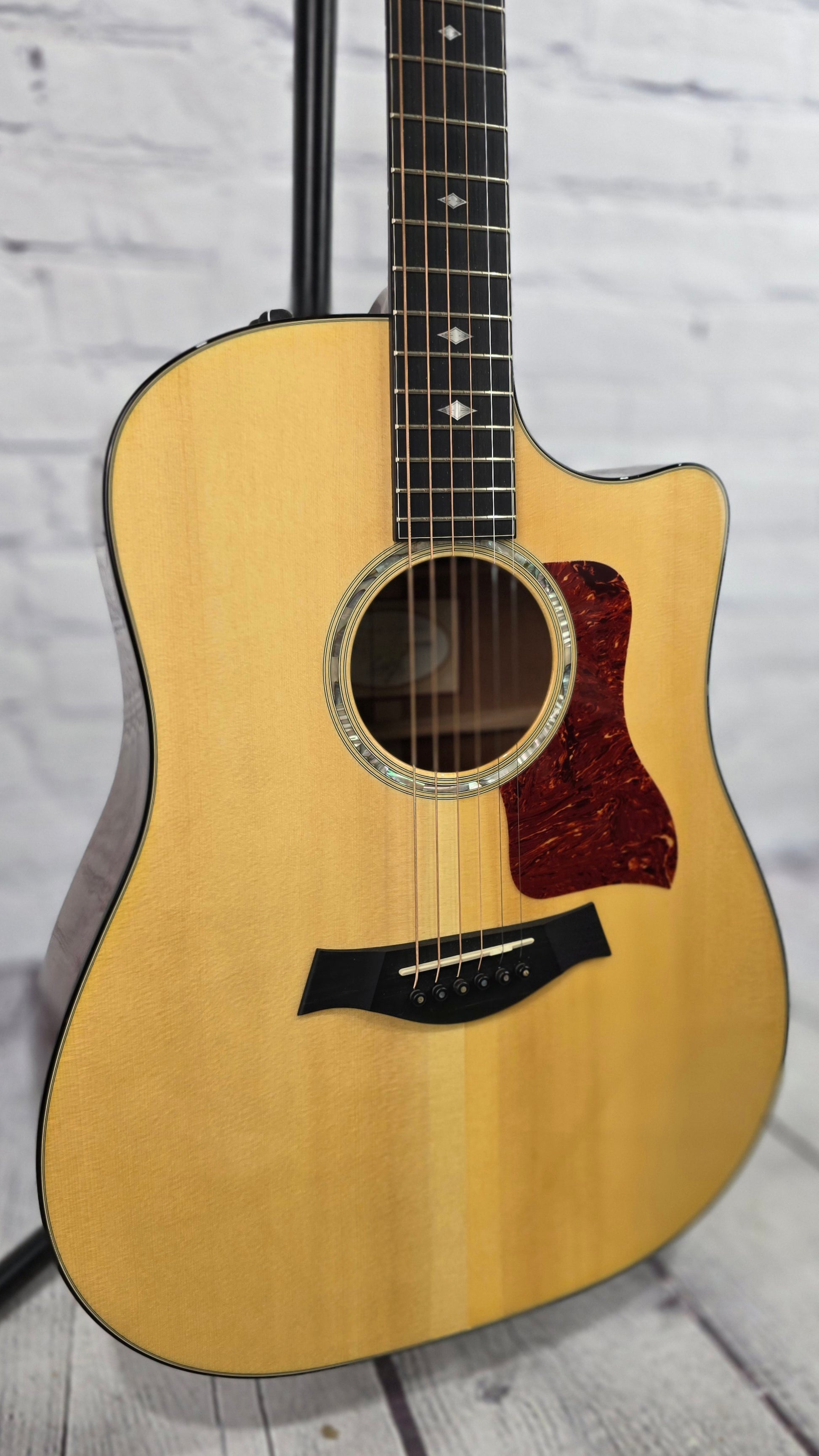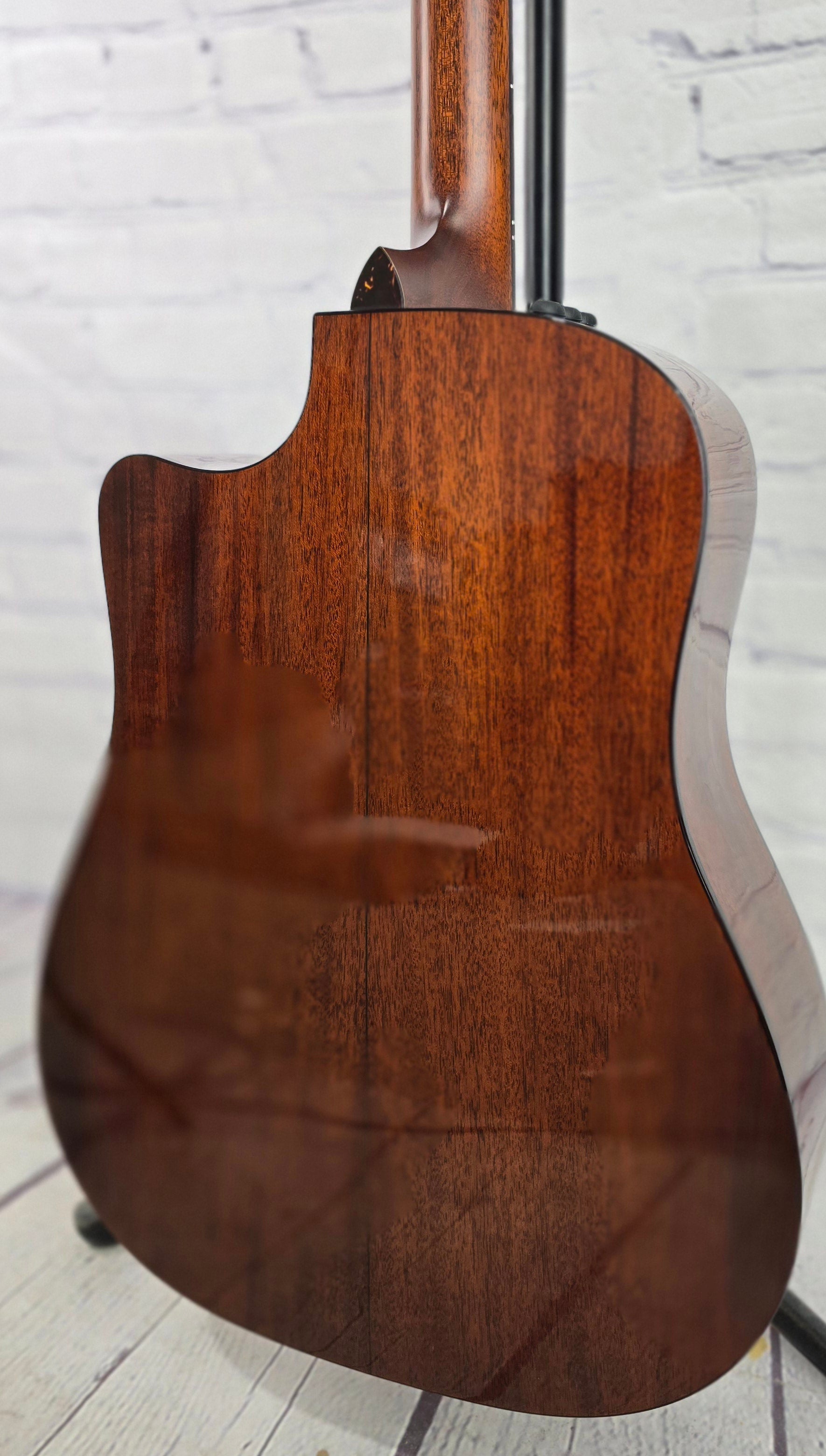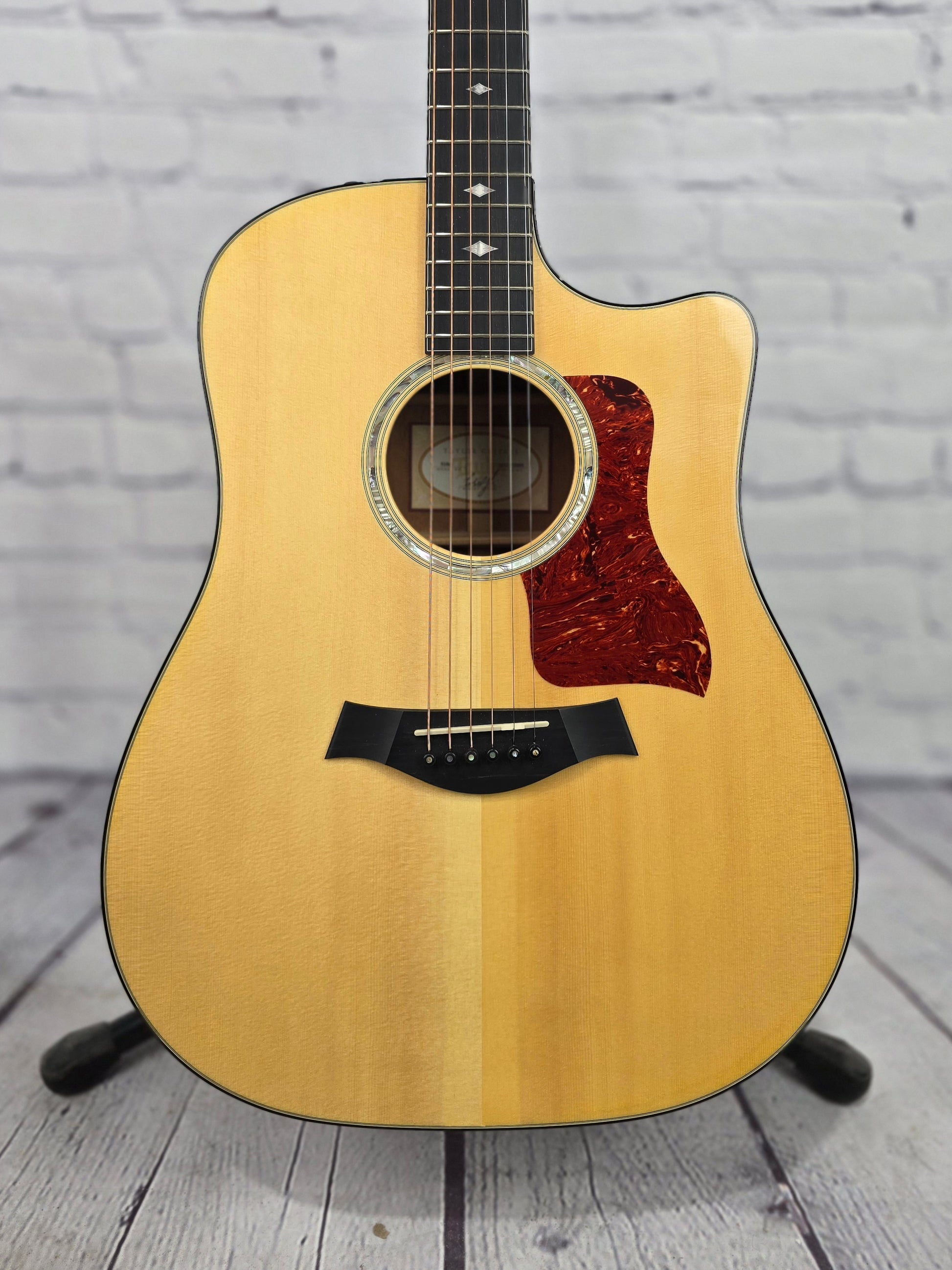 With a new design for 2012, the Taylor 510-CE Dreadnought combines the rich midrange of tropical mahogany and the warmth and strong projection of Engelmann spruce. The refined appointment package of the 510-ce features a new design laser engraved pearloid deco diamond inlay, faux tortoise shell binding on both, body and neck, and a dark body stain that honors mahogany's heritage. Dreadnought power, rich mid-range, access to the upper register, and the Taylor Expression System give this mahogany cutaway a full, well-defined presence.