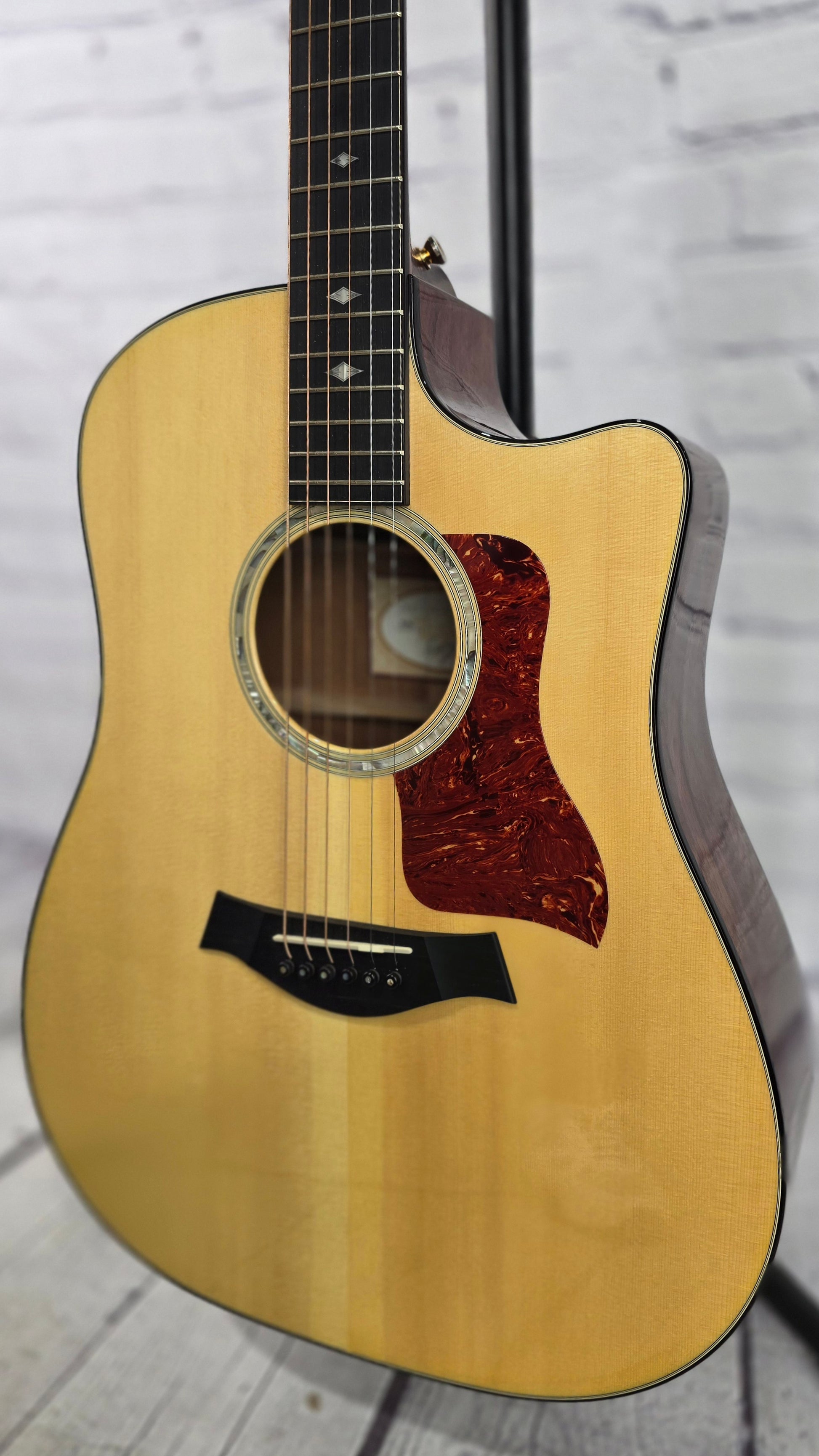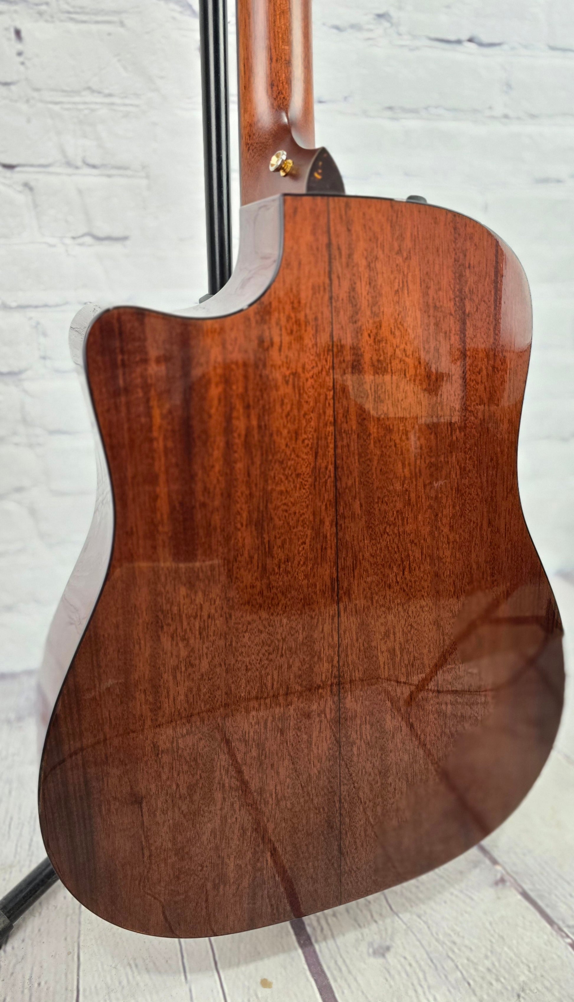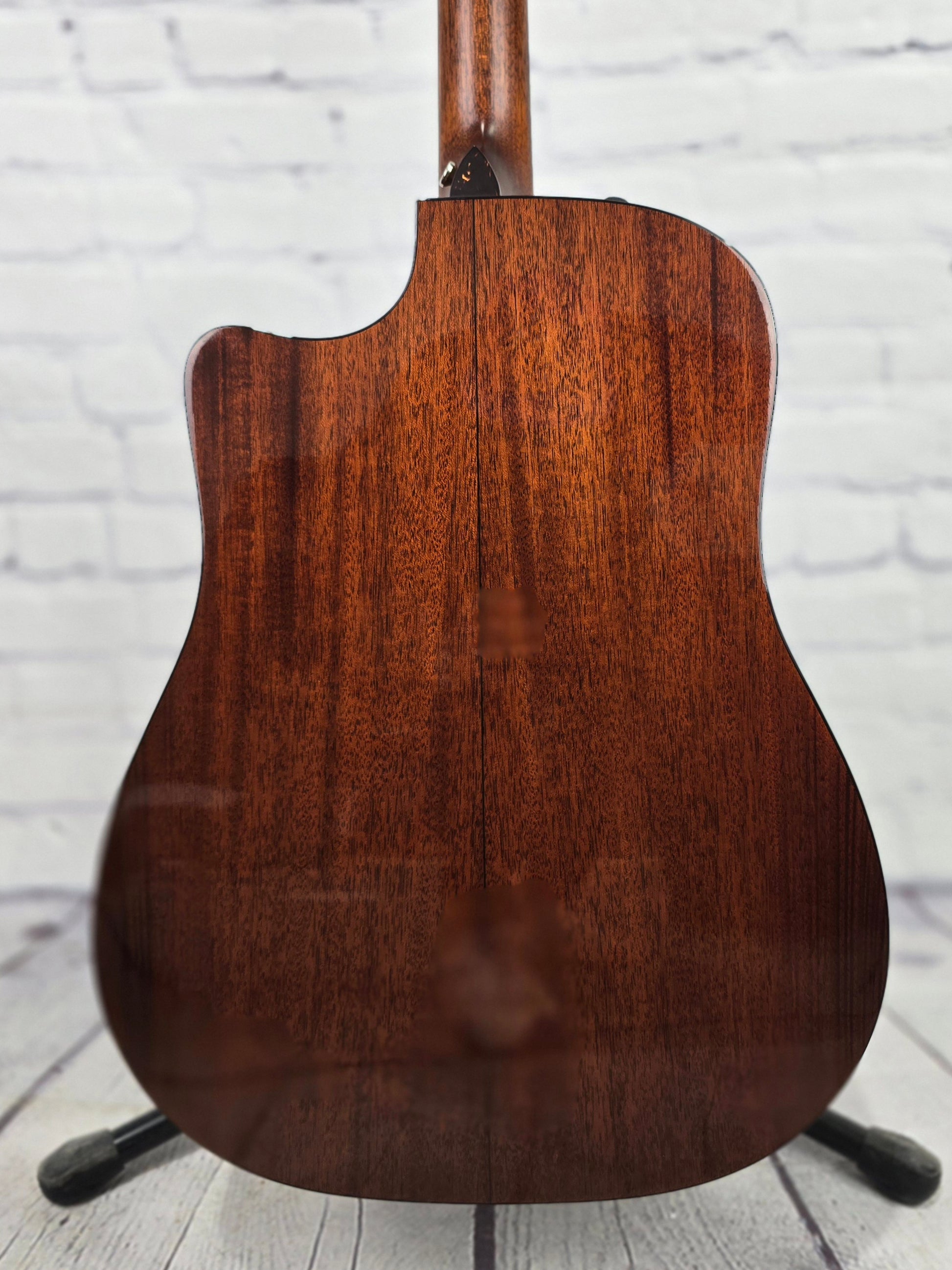 With a new design for 2012, the Taylor 510-CE Dreadnought combines the rich midrange of tropical mahogany and the warmth and strong projection of Engelmann spruce. The refined appointment package of the 510-ce features a new design laser engraved pearloid deco diamond inlay, faux tortoise shell binding on both, body and neck, and a dark body stain that honors mahogany's heritage. Dreadnought power, rich mid-range, access to the upper register, and the Taylor Expression System give this mahogany cutaway a full, well-defined presence.