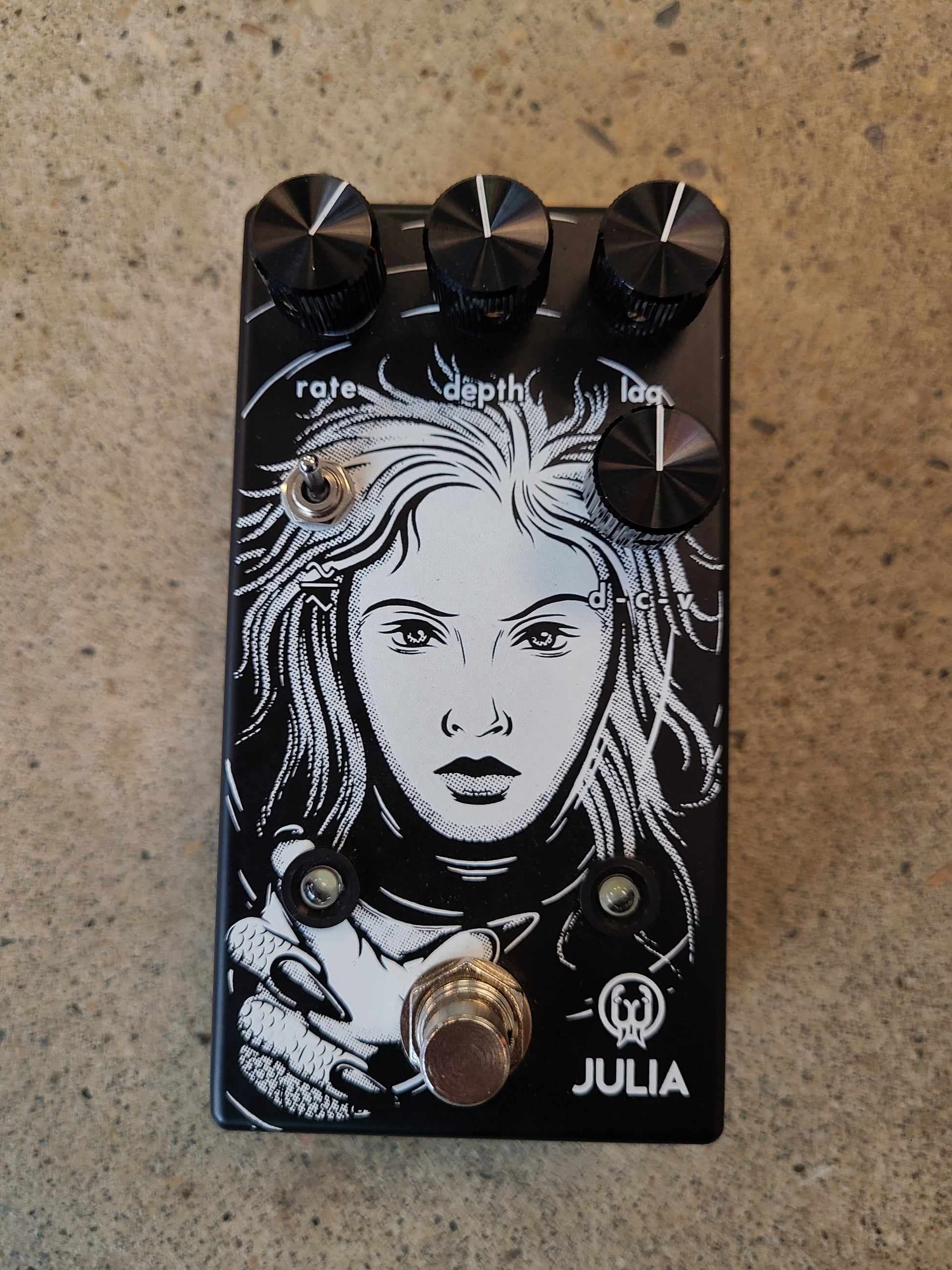 While most chorus/vibrato pedals offer a toggle to go between the two effects, we’ve provided a knob to blend between Dry, Chorus, into Vibrato (labeled d-c-v on the pedal). The Dry-Chorus-Vibrato Blend changes the ratio of dry to wet signal sent to the output. At minimum, you will hear no effect. Set it to noon for equal parts dry and wet – the traditional chorus setting. Set it to maximum for 100% wet – the traditional vibrato setting. Explore the ground between minimum and noon for adding slight amounts of movement to your dry signal (also making the Julia great on bass guitar). Explore the ground between noon and maximum for all sorts of unheard chorus/vibrato combinations.