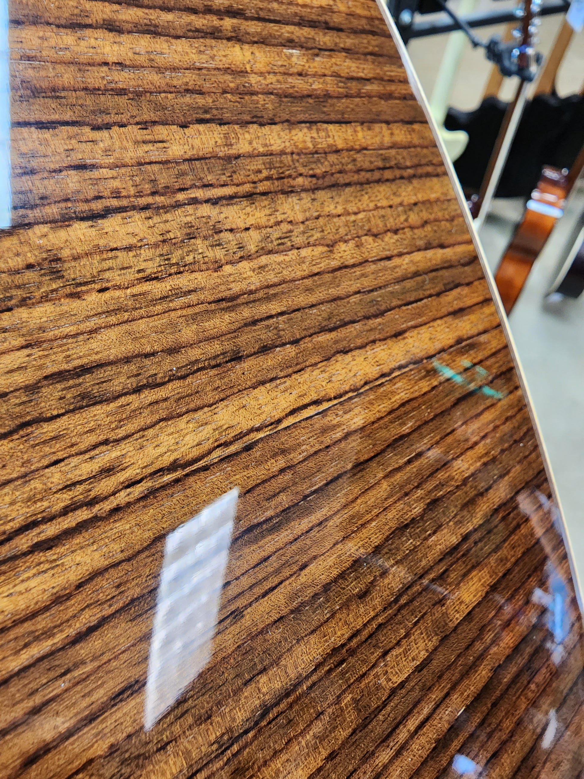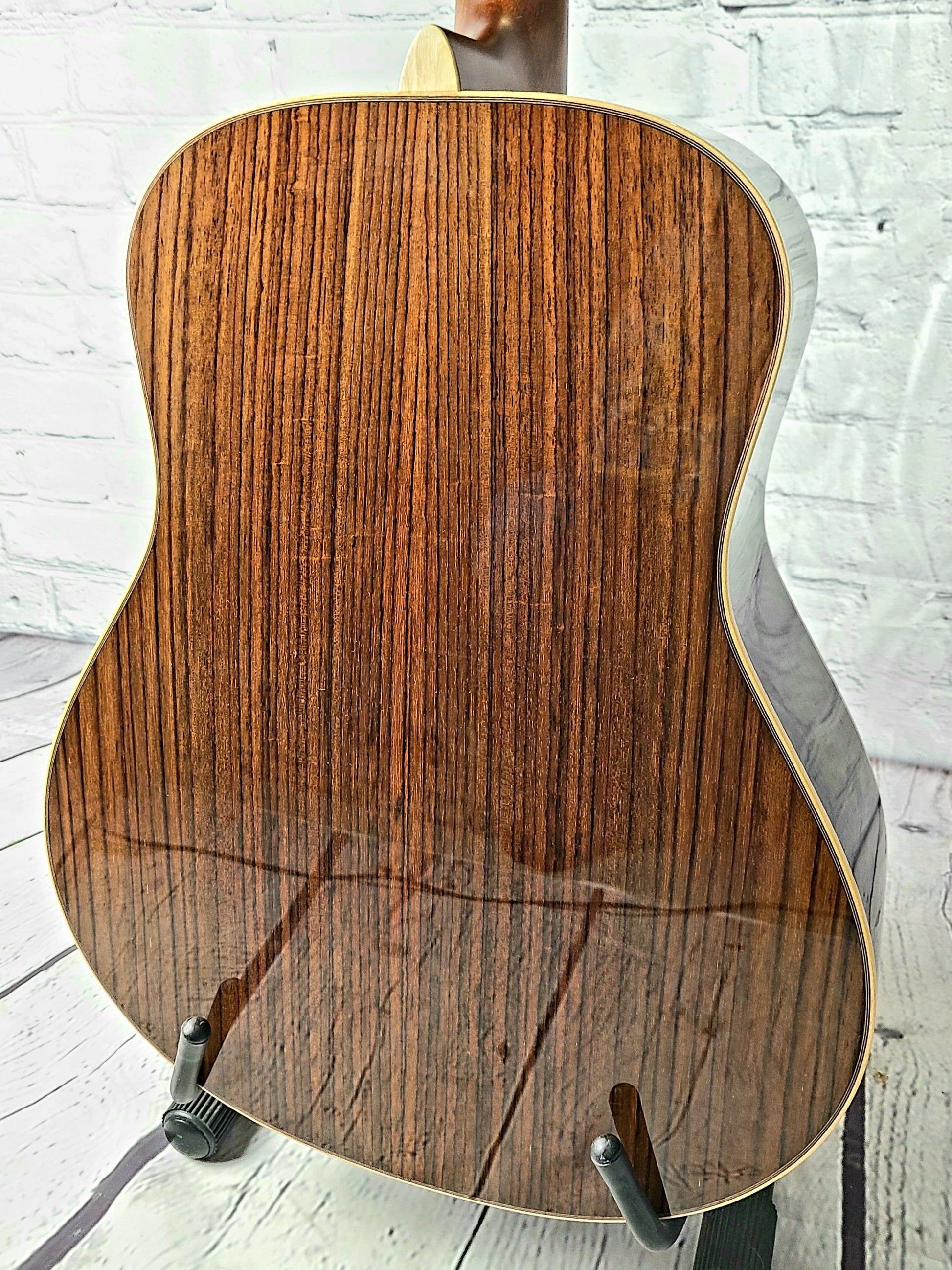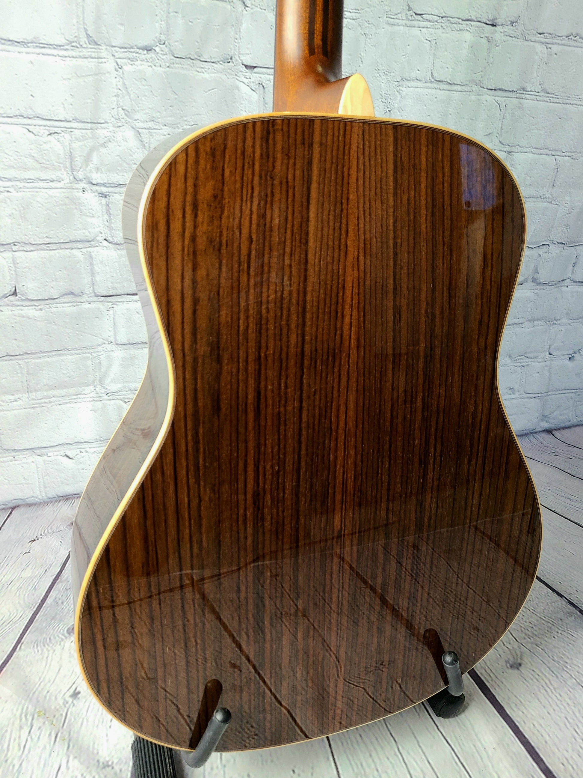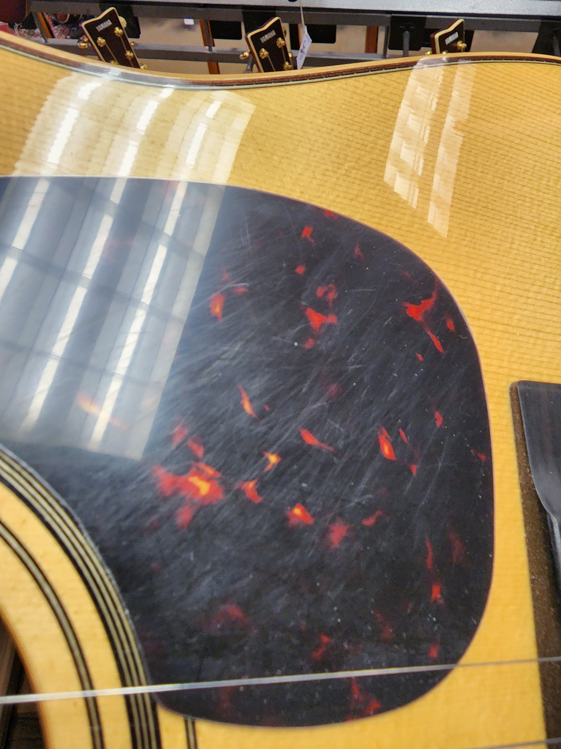 Used Yamaha LL26 Acoustic Guitar just in! Originally sold here, this is an exceptional instrument that rings beautifully. There is a small ding on the front lower edge of the top and does have some pickguard swirl from being played. It does also have a distinct crack in the rear clear coat directly over the seam where the two pieces of rosewood are joined. This is almost invisible, but can be felt by dragging a fingernail over the joint.
